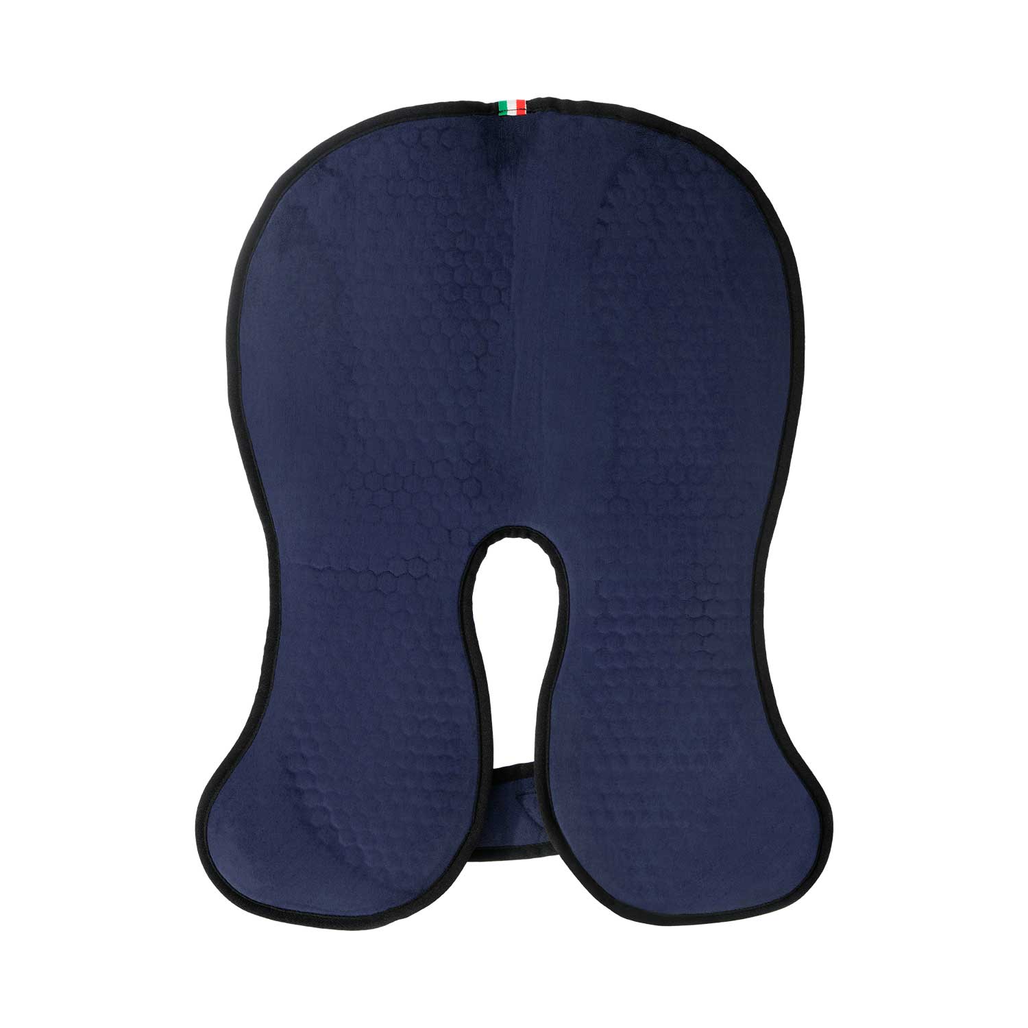 The Acavallo Pad SP WFS Suede Hexagonal Gel Flat is designed to enhance equine comfort by preventing wither compression. Its non-slip hexagonal gel structure, combined with breathable suede and 4mm open-cell foam, provides superior cushioning and ventilation. The innovative gel cells compress and release air with each movement, creating an air cushion effect that adapts to various English saddle sizes and styles. A thinner central section ensures optimal fit and freedom over the withers, making this pad a technologically advanced choice for horse and rider.