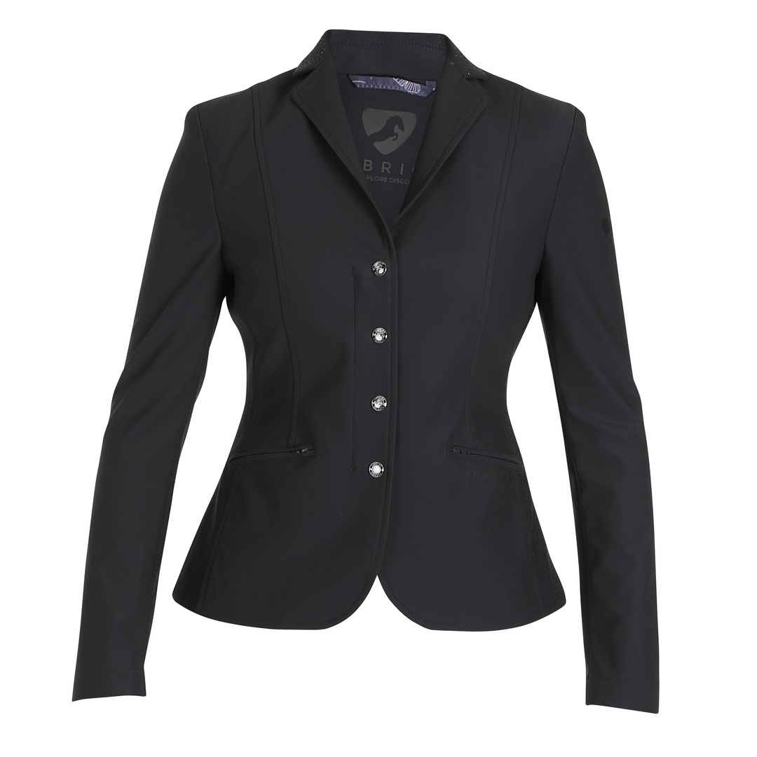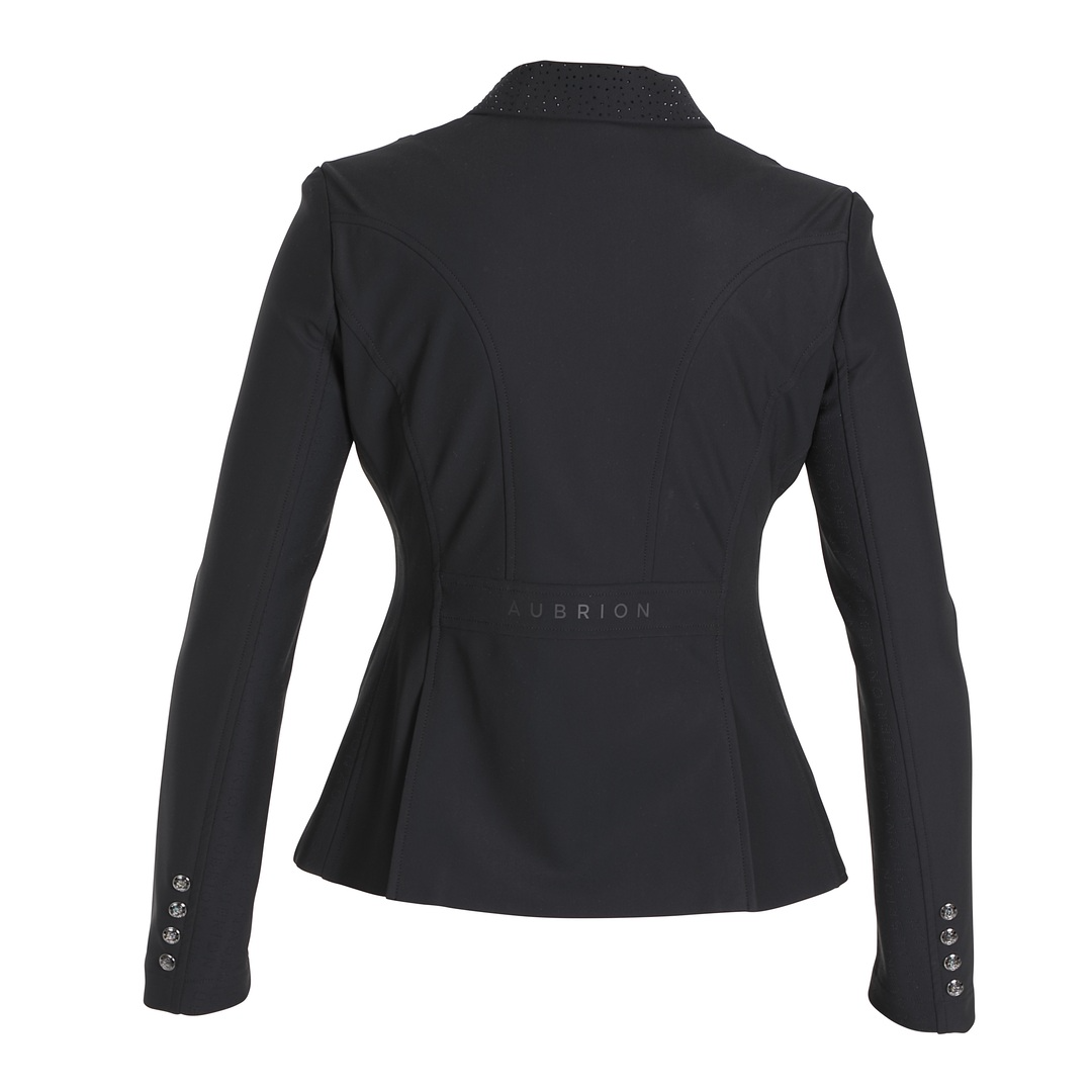 The Shires Aubrion Ladies Newton Show Jacket shimmers under the spotlight and has a modern saddle-skimming length with a slim contour shape. Self-colour rhinestone studded collar is complimented by sparkle enamel buttons at the centre front and cuffs. Multiway flex-fit fabric and unlined sleeves give the competitive rider total freedom and a sleek look. Perforated side and under arm panels look stylish and offer targeted ventilation, fabric is quick drying and breathable.