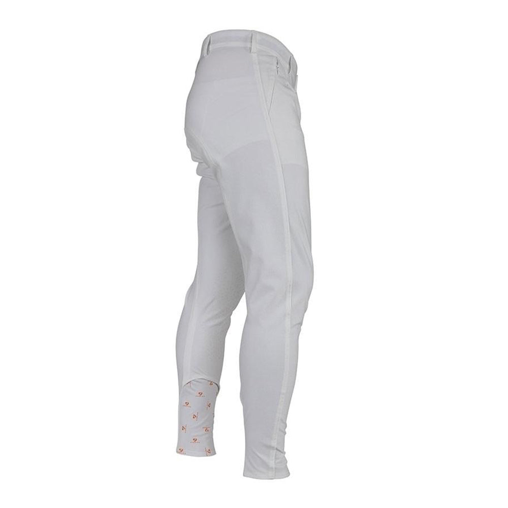 Smart, performance breeches with a contour seat and silicone knee patches. Style detail: pleat front, zip hip pockets, belt loops, stretch lower leg cuffs, Aubrion prints.