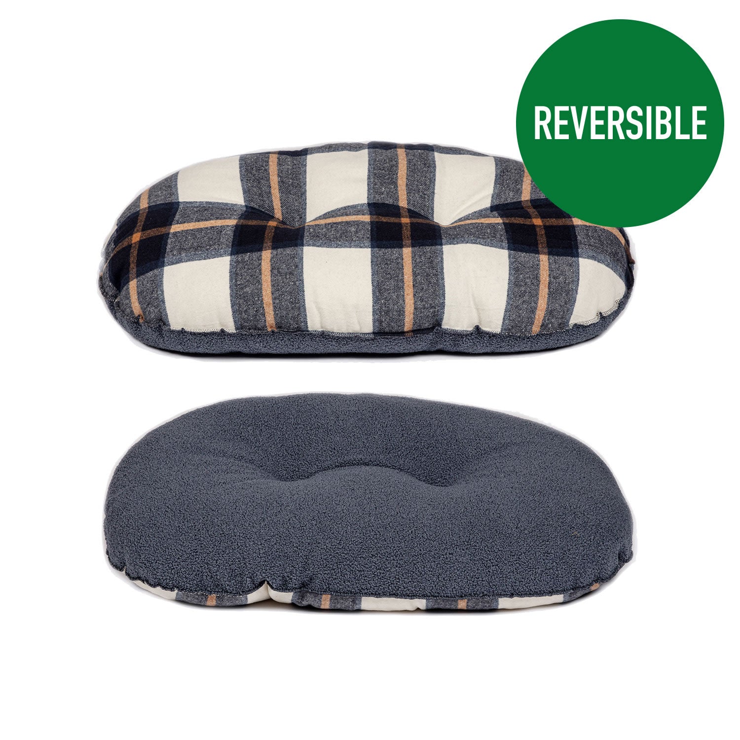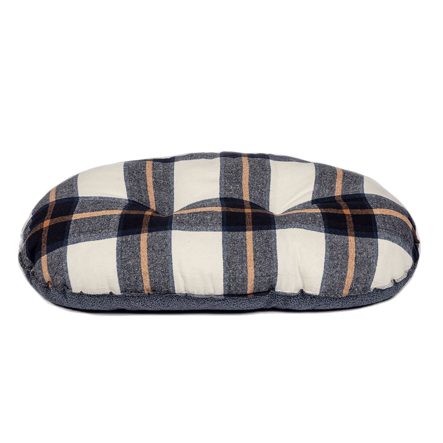 A navy brushed check with tan highlights featuring a petrol blue-grey loop knit boucle fabric on the reverse. The mattress is filled with a soft and fluffy polyester fibre filling which provides a lot of warmth and comfort.