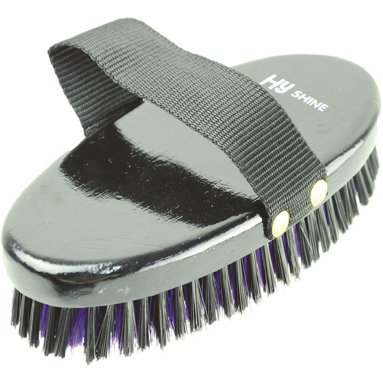 Black lacquered medium oval body brush with black and purple alternative circle style soft PP bristles and PP strap.
