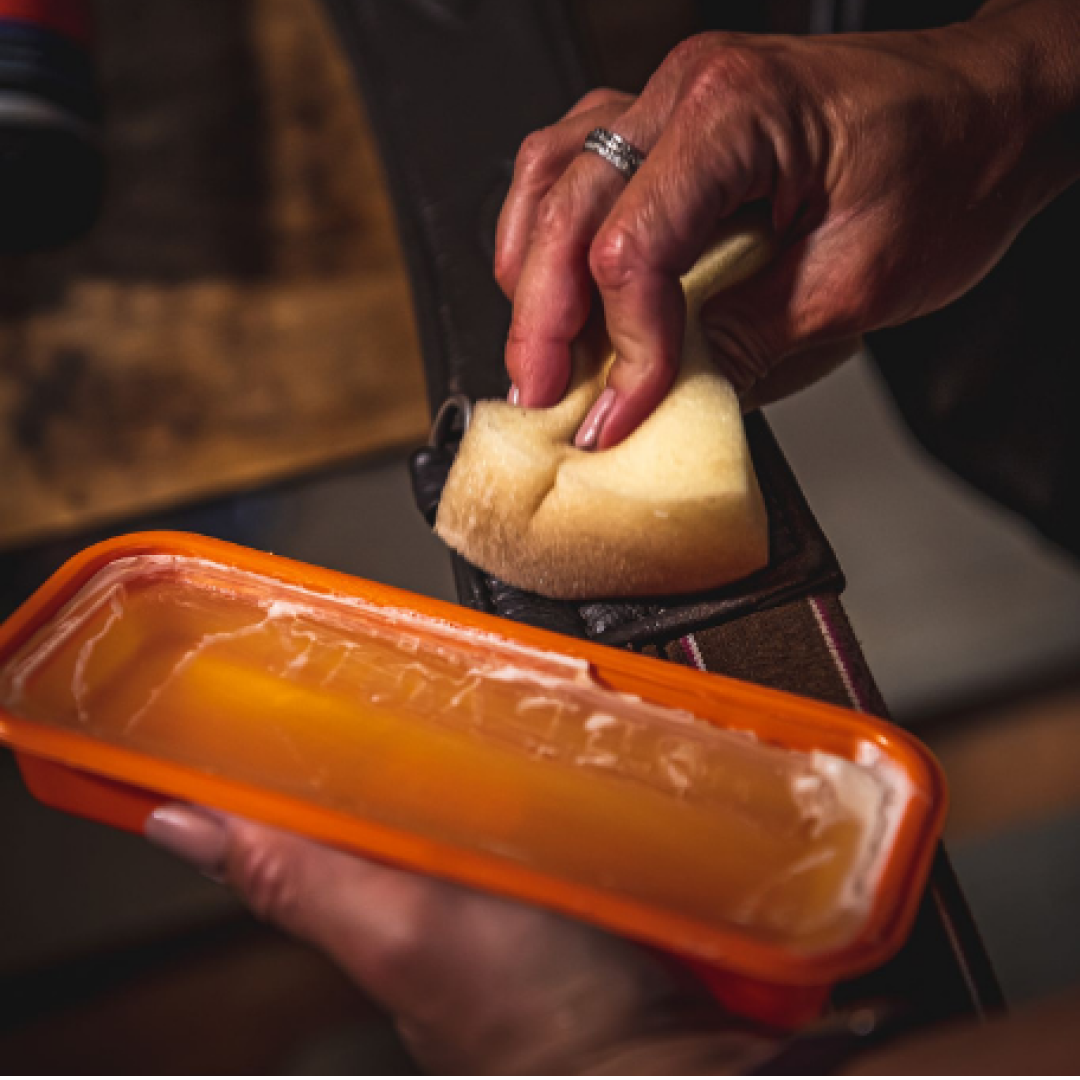 In a re-sealable tray, the original, traditional bar soap that conditions, protects and adds shine to leather. This pure, clear quality soap is formulated from vegetable oils, including coconut oil and glycerine for regular use. The glycerine fills and seals pores in the leather to form a barrier against salt, dirt, grease and water. Use after ‘Step 1’ Belvoir Tack Cleaner.