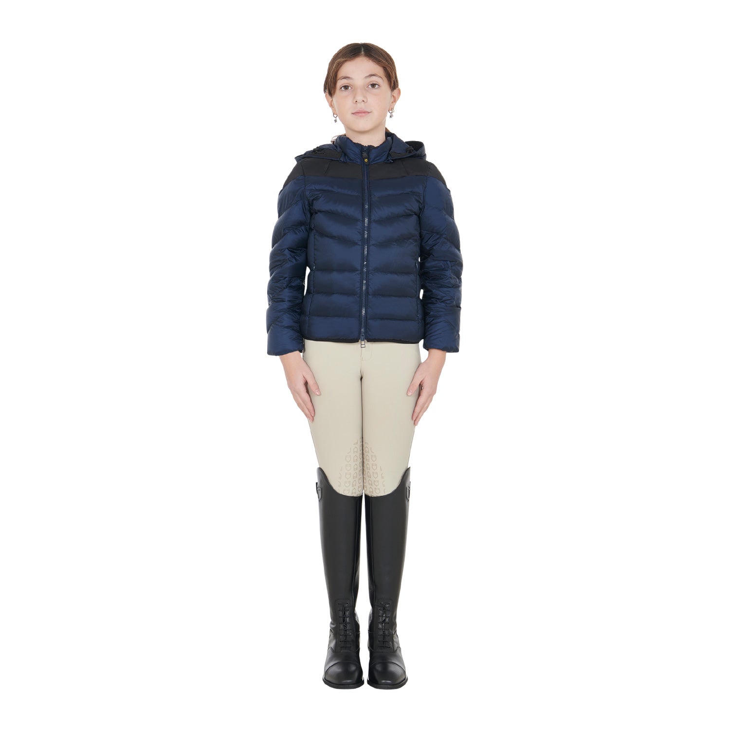 Girls' slim fit down jacket with removable hood. The anatomical cut makes the garment elegant and youthful. Girls' slim fit down jacket with removable hood in technical fabric and windproof zip.