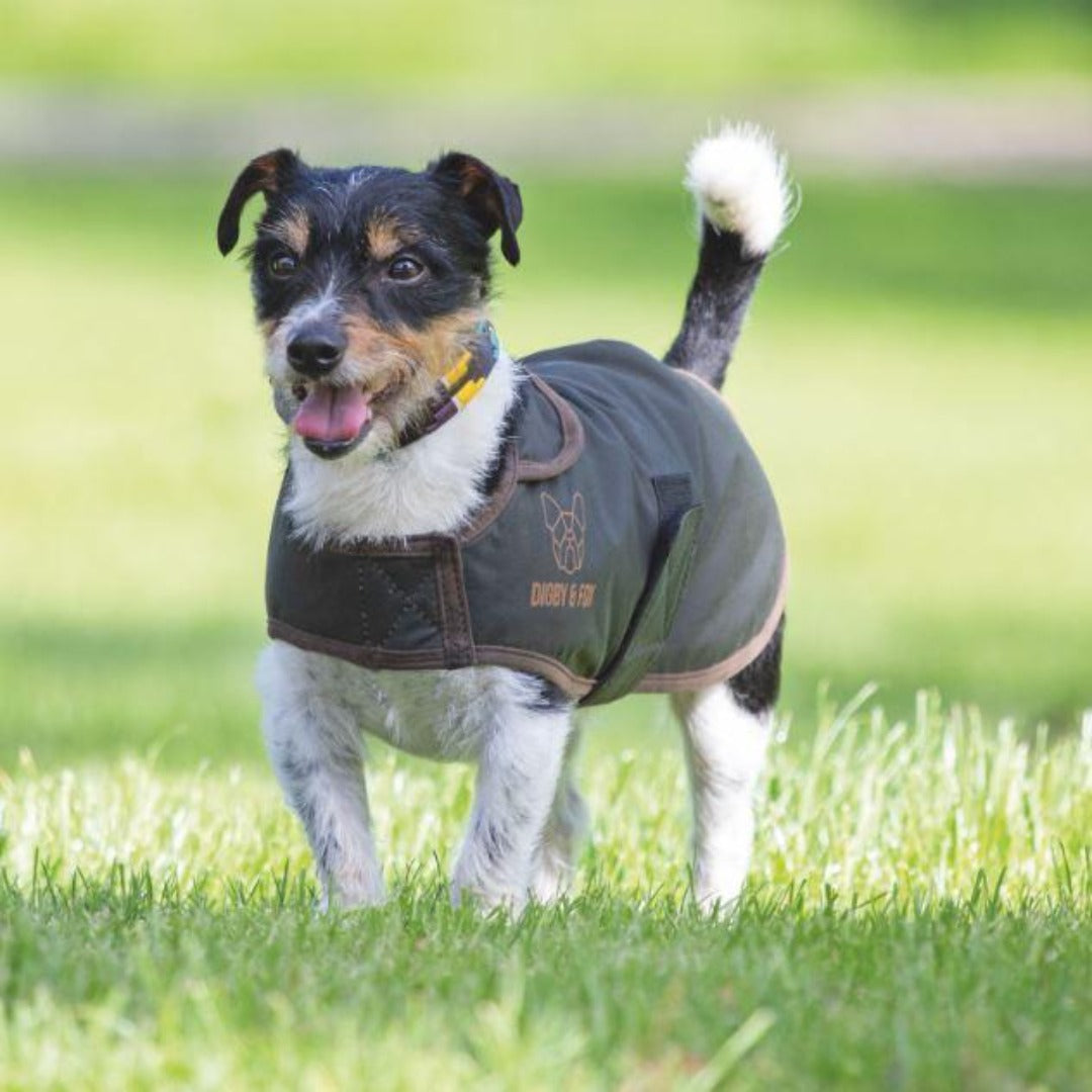 The Digby & Fox Wax Coat (Olive) is a coat designed to be water resistant, and has an inner that keeps the dog warm.
