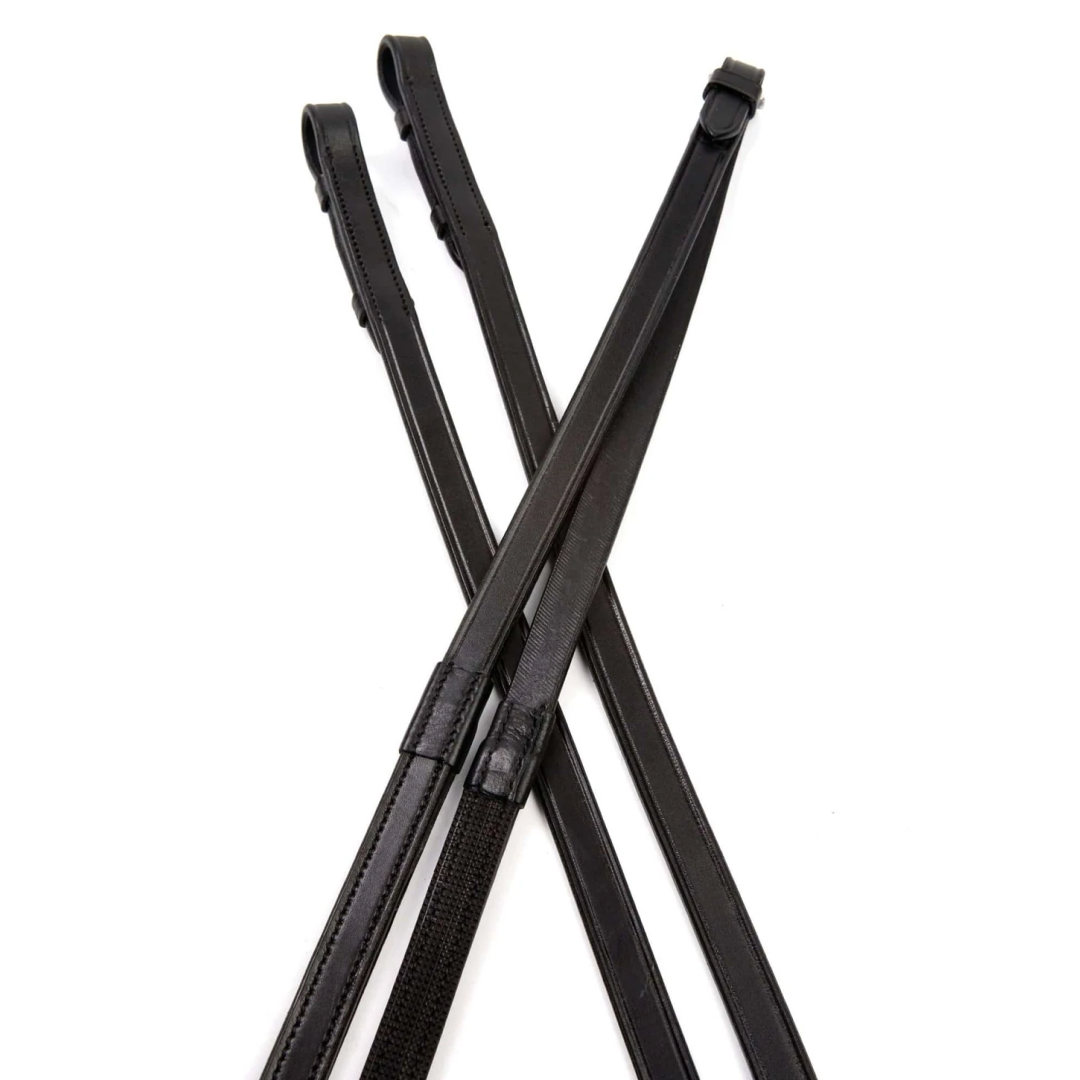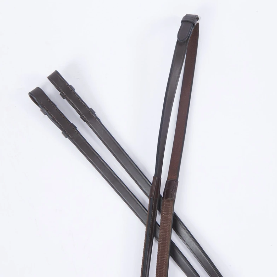 The Collegiate One Sided Rubber Reins are quality European leather with a rubber grip backing giving them the appearance of plain reins with hidden additional grip.