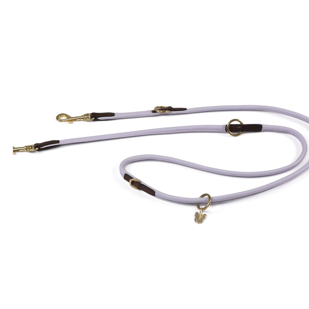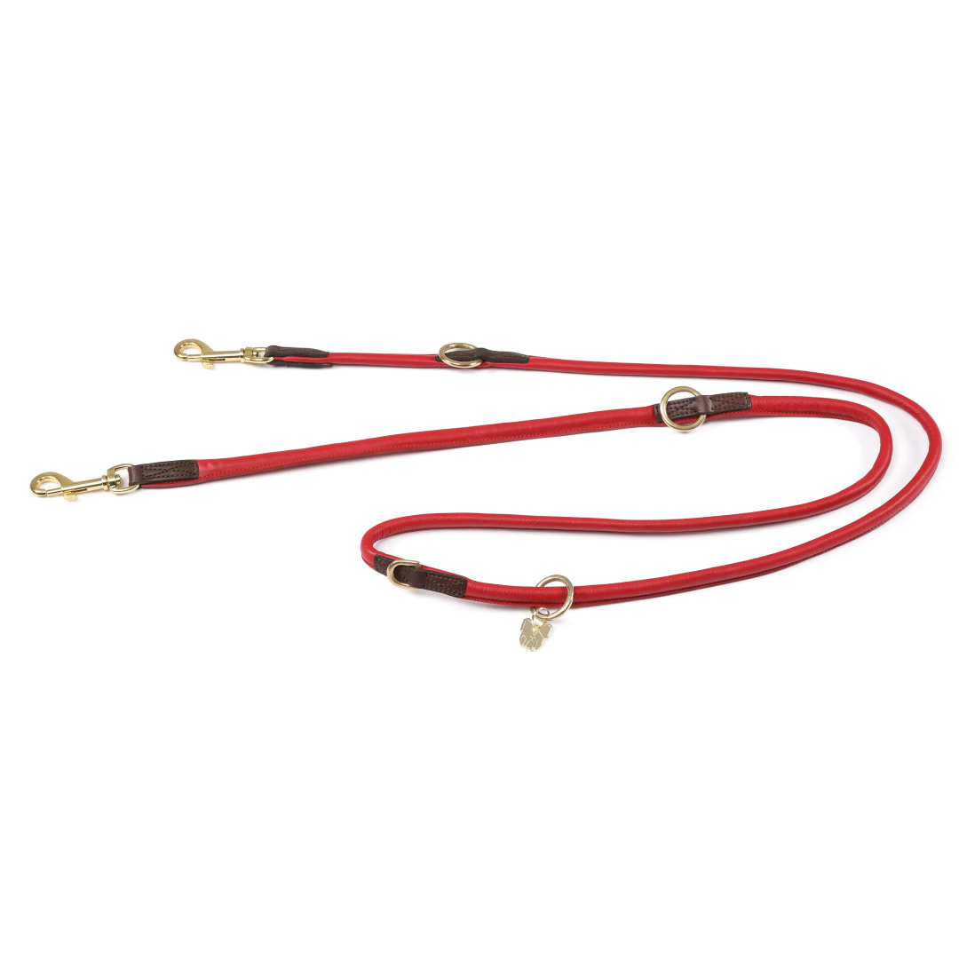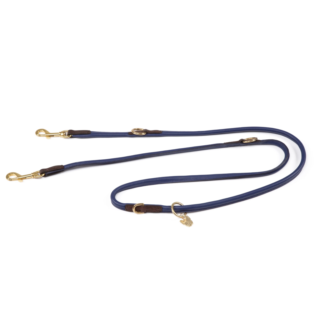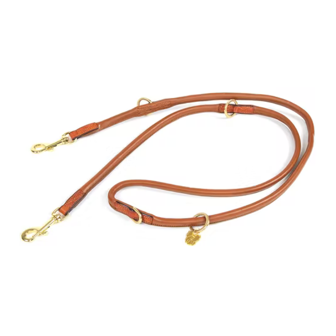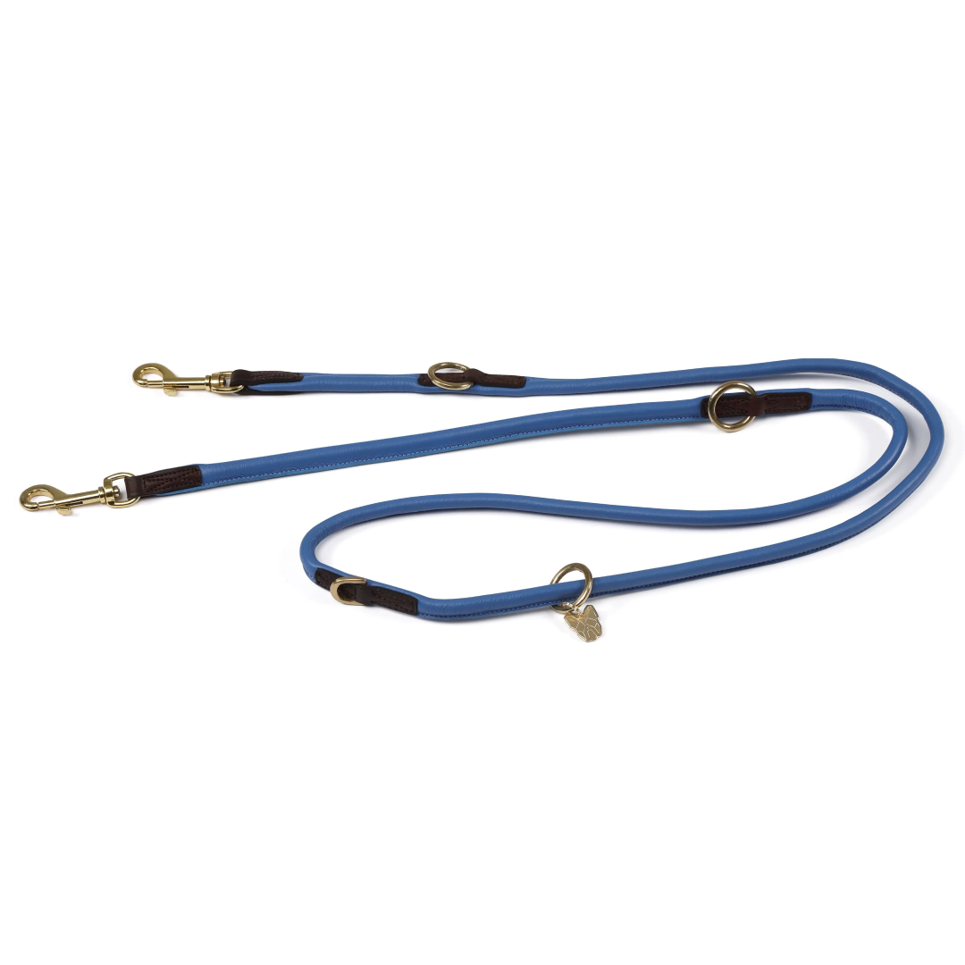 Super soft leather and brass fittings make these elegant collars and leads comfortable for both dog and handler. This multi-function double-ended lead is ideal for training, or as a versatile lead solution for any owner. Adjustable length, hands free and use with two dogs options. Features brass rings and brass swivel trigger clips to reduce twisting. Length: 180cm.