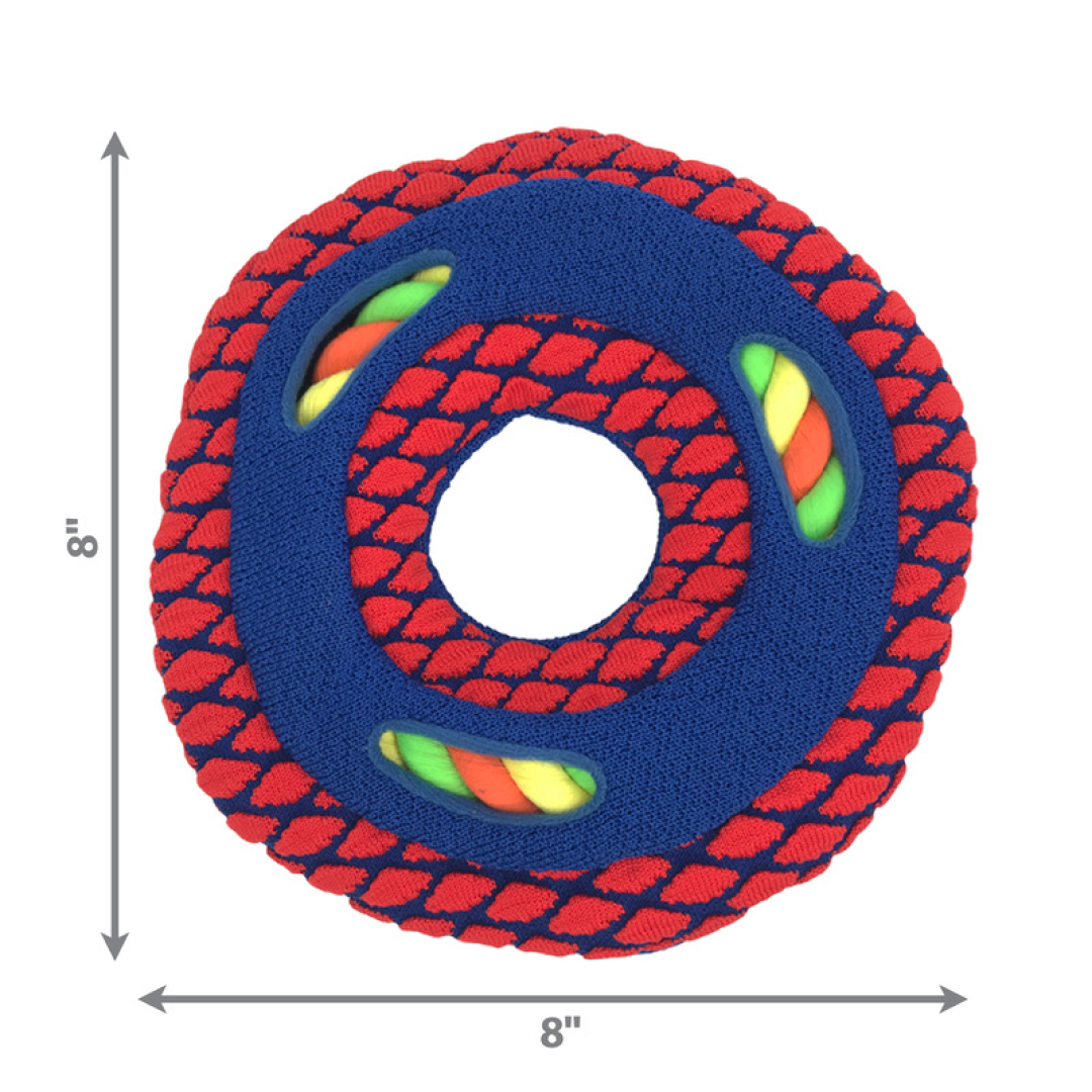 KONG Sneakerz Sport features a textured tennis shoe material that provides durability for long-lasting runs of fun. The grippy toy features peek-a-boo windows that pique foraging instincts while the internal twisted rope rewards chewing needs. The disc shape is ideal for engaging fetching sessions and the multiple squeakers are sure to extend.