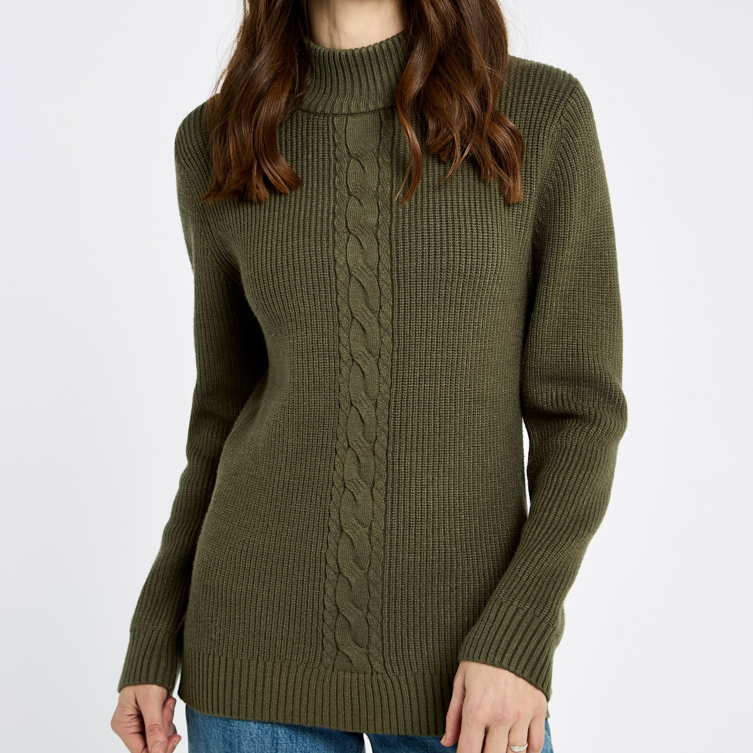 • Flattering placed cable stitch on front