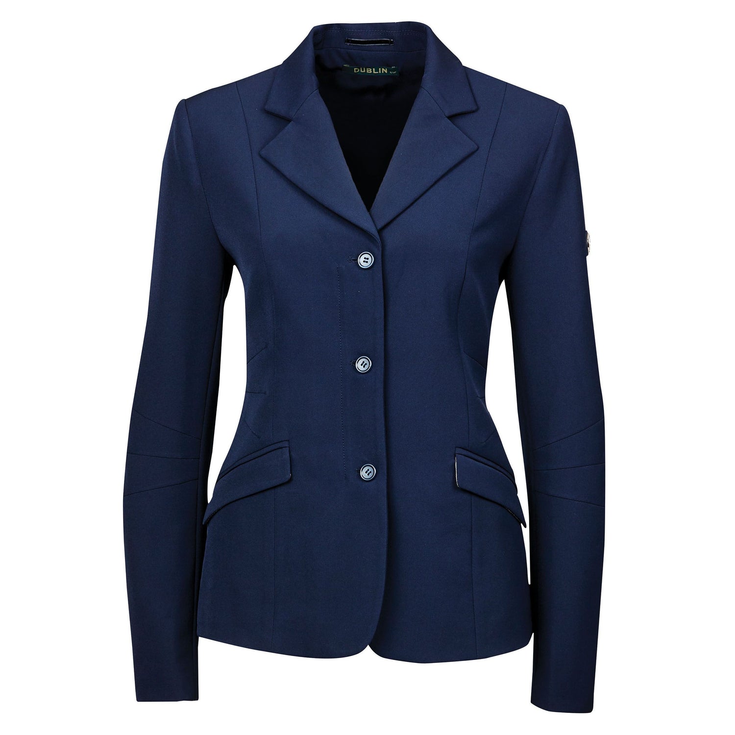 Tailored competition softshell jacket that is water repellant and breathable. Stretch fabric allows easy freedom of movement for comfort. Fully lined. Machine washable for easy maintenance. Stylish button detail on front & cuffs. Hidden center zip closure. Hanger and garment bag included.