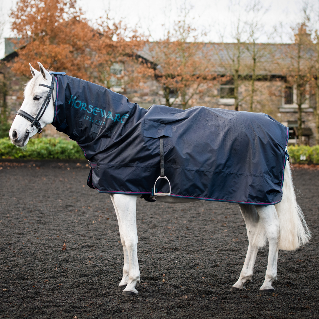 - Lightweight waterproof rug protects your horse and tack from the elements. It has an integrated neck cover, stirrup slits and belly strap, ideal for use on rainy show days. Comes with a handy storage bag.