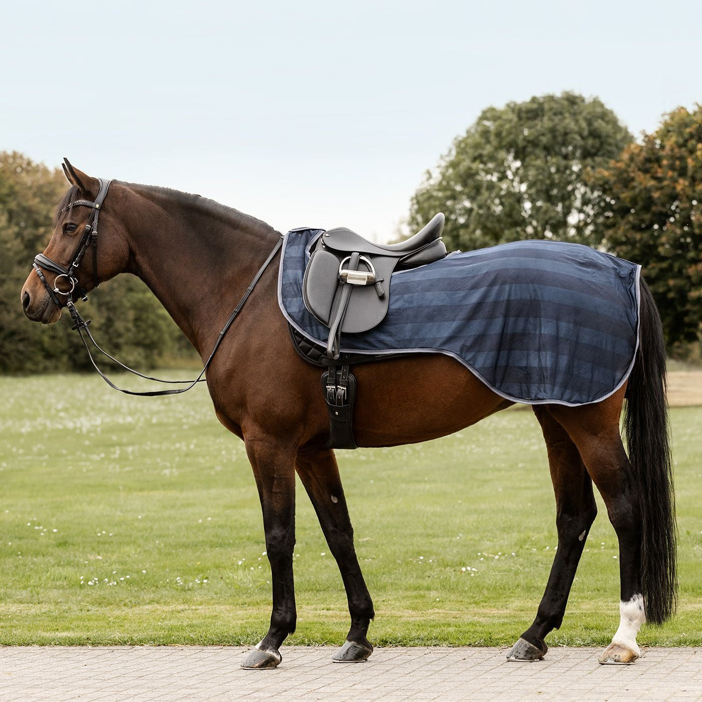The stylish fly exercise sheet impresses with its classic design and is fastened at the withers with a practical Velcro fastener. It has a saddle cut-out and provides reliable protection against annoying flies. In addition, a deep hindquarters cord ensures that the blanket always stays in place and does not slip.
