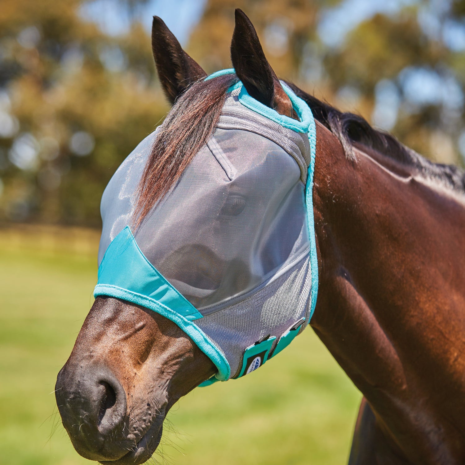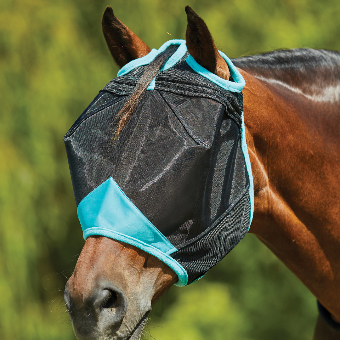 Designed with vision, comfort and durability in mind. Fine mesh allows for full vision and protection from smaller insects with double darts for a superb fit and adjustable double touch tape tabs for ease of use. Soft fleece binding and hole to pull forelock through for additional comfort with stretch fleece poll for a secure and comfortable fit. Offering 60%+ UV Block.