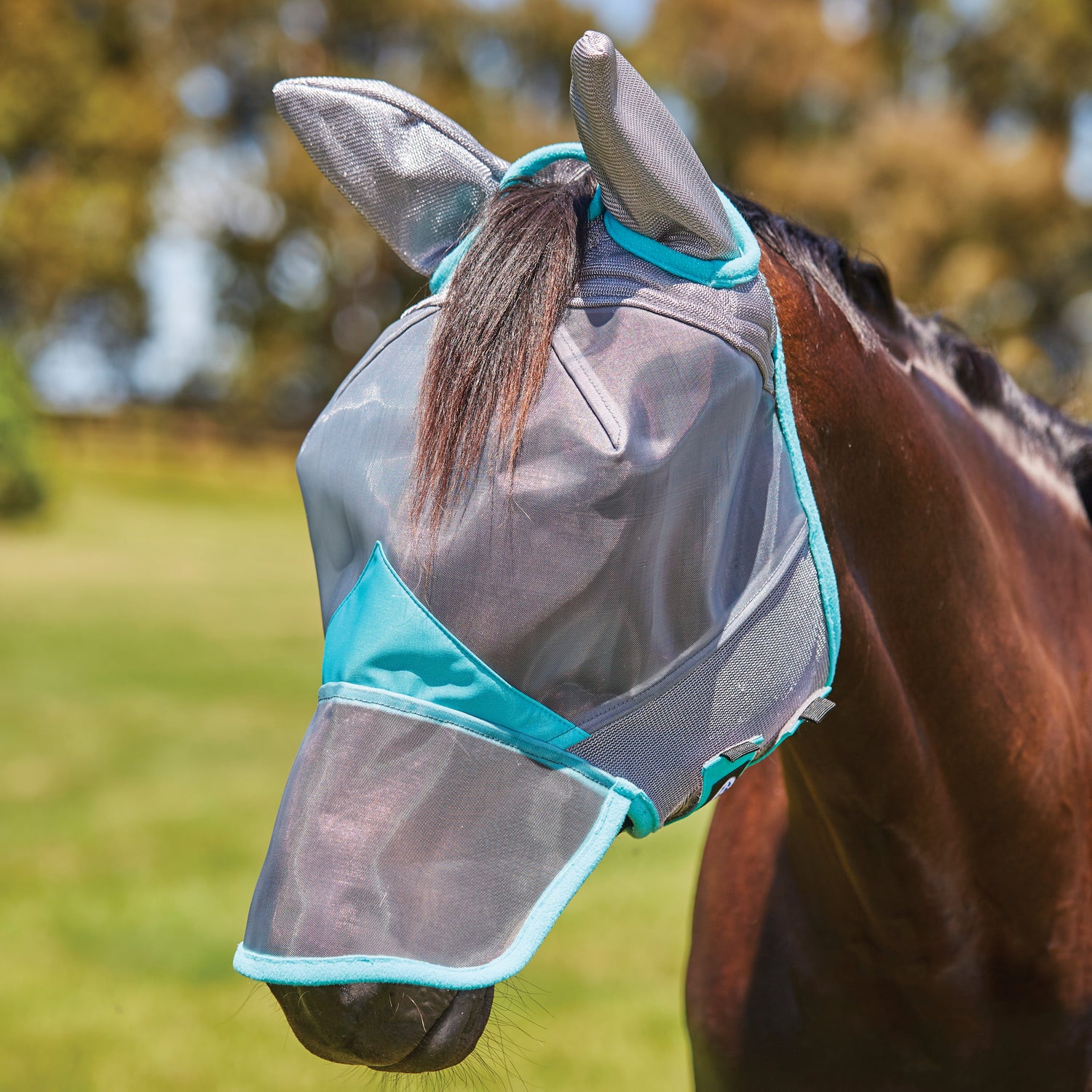 Weatherbeeta ComfiTec Deluxe Fine Mesh Mask With Ears & Nose - Black/Turquoise / Mini is backordered and will ship as soon as it is back in stock.