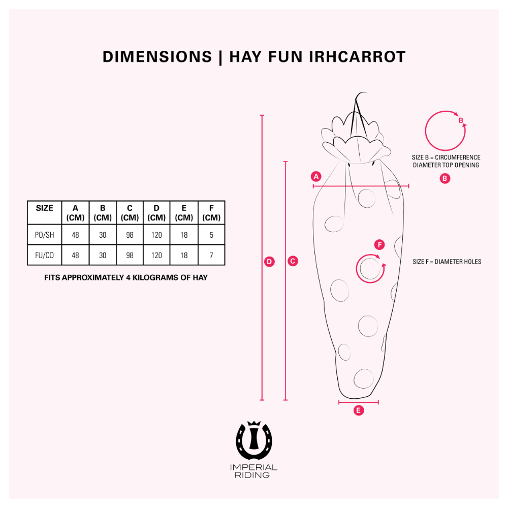 Keep your horse entertained with this fun carrot shaped haybag. The haybag is available in two size holes.