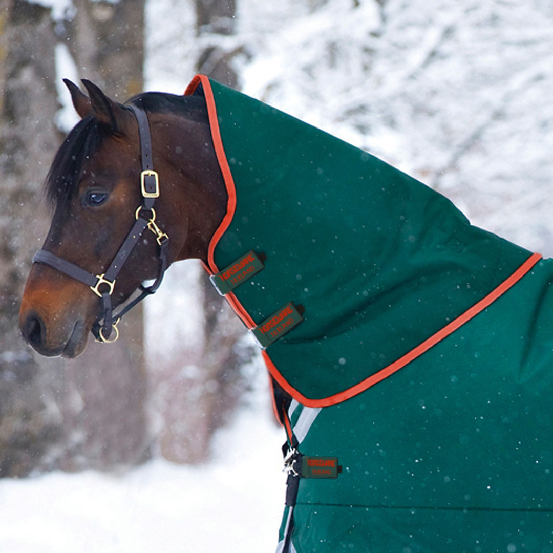 Surefit neck design, sitting further in front of the wither with a smoother slope to cup the front line of the shoulder and finish deeper in the front of the neck, Sure-fit by name and nature, this design gives a snugger fit yet the deeper neck allows more freedom to graze. Always used in conjunction with our V-Front closure, which provides freedom of shoulder movement to prevent rubbing and aids in reducing wither pressure.