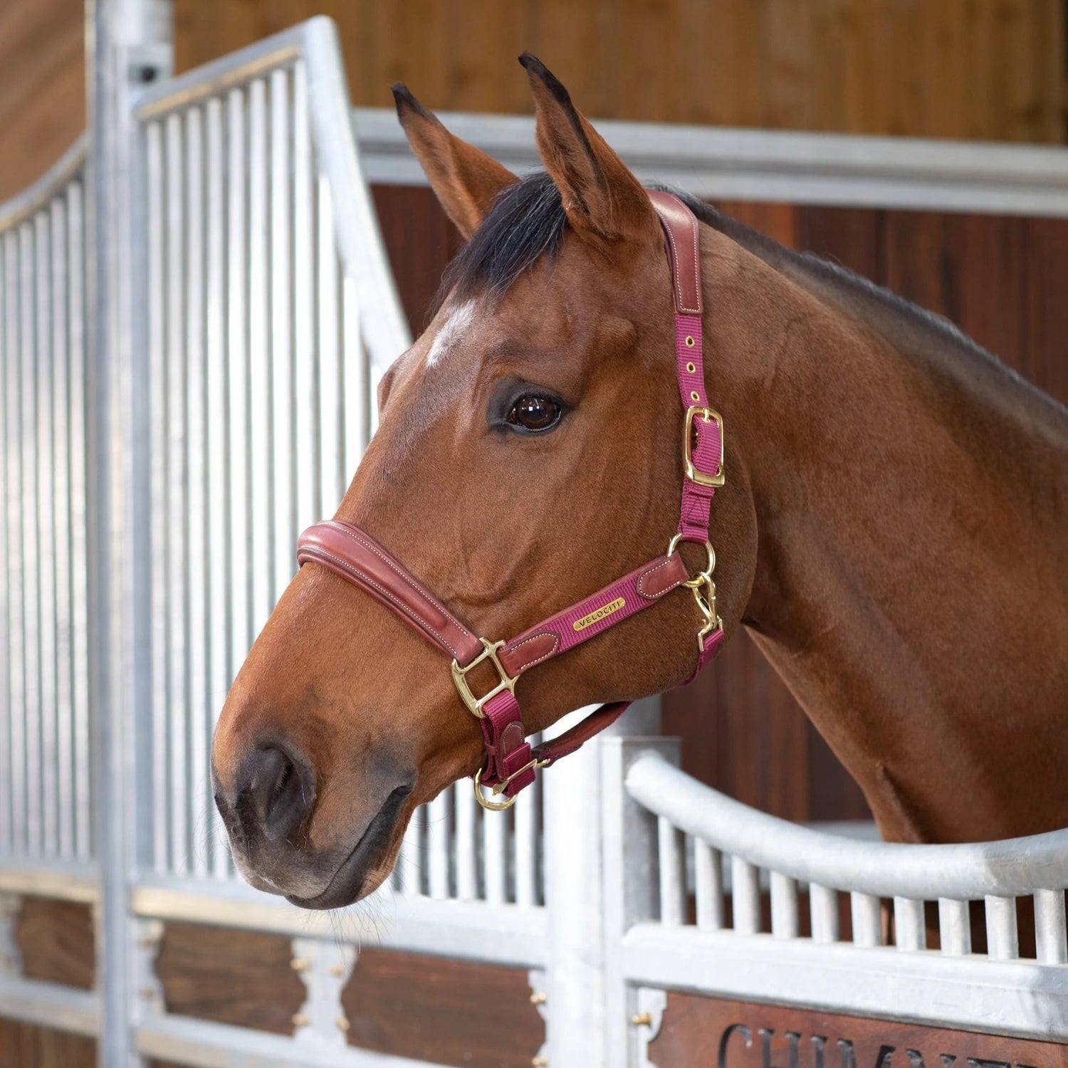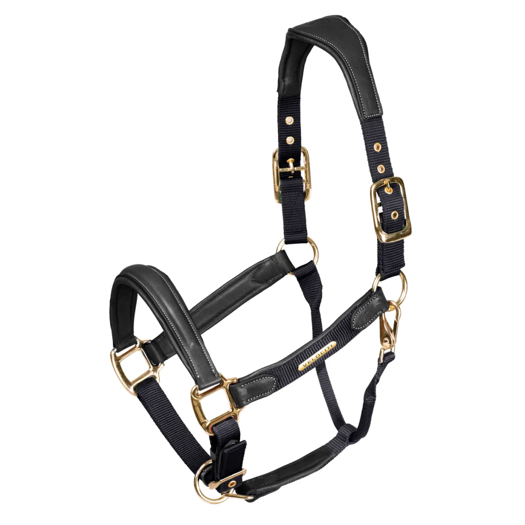 Anatomically shaped at the head and nose to disperse pressure, soft cushioned leather padding for enhanced comfort. The headcollar fastens with a double ended headpiece. A clip throatlash offers convenience. Double layer nylon inserts add strength and a contemporary feel. Durable brass colour eyelets and solid metal high shine fittings. A Velociti plate adds a distinguished feel.