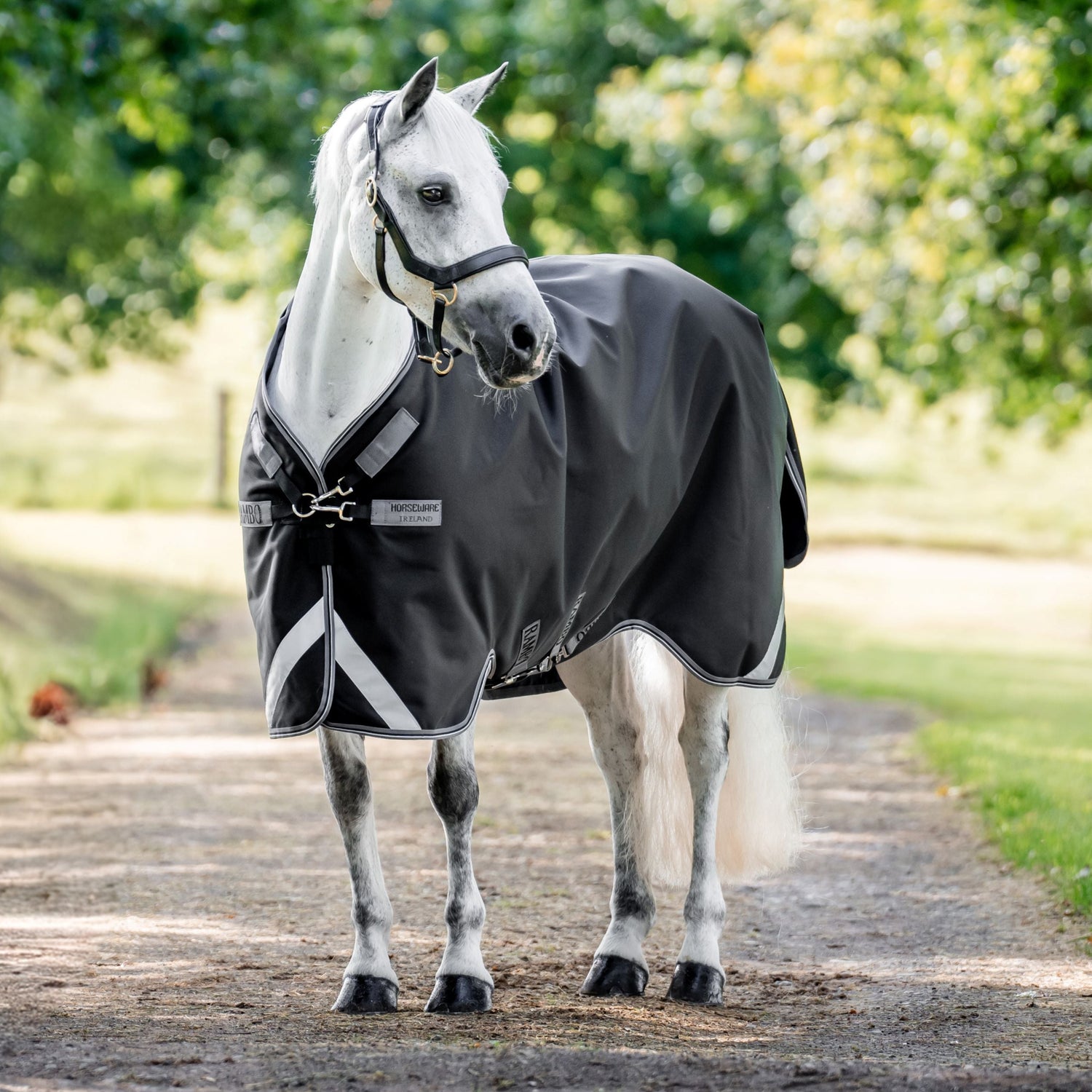 Featuring a V-Front Closure that eliminates pressure on the shoulder allowing for more comfort while grazing. Compatible with the Horseware® liner system and Rambo® turnout detachable hoods, offering numerous choices and flexibility. Dual leg arches, to maintain freedom of movement while allowing the rug to stay secure under belly. Reflective strips for increased visibility, anti-bacterial, anti-static and shine-enhancing embossed lining promoting a healthy coat.