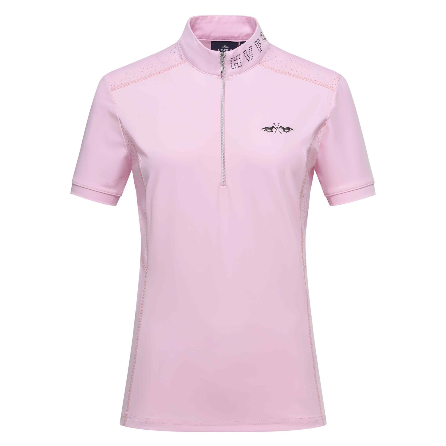 The blind zip closure at the center front adds a sleek element, while short sleeves with fine cuffs enhance overall comfort. The baby lock on seams and a 3D logo heat transfer on the chest contribute to its stylish design. Notably, the HV Polo in rhinestones on the collar and a functional print inside below the neckline add unique finishing touches.