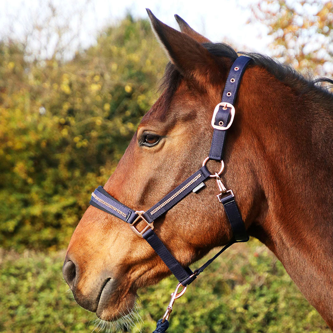 Beautifully crafted with delicate diamante detail, featuring on the nose and cheek pieces. Finished off with a buckle headpiece and clip fastening. Comes with matching lead rope.