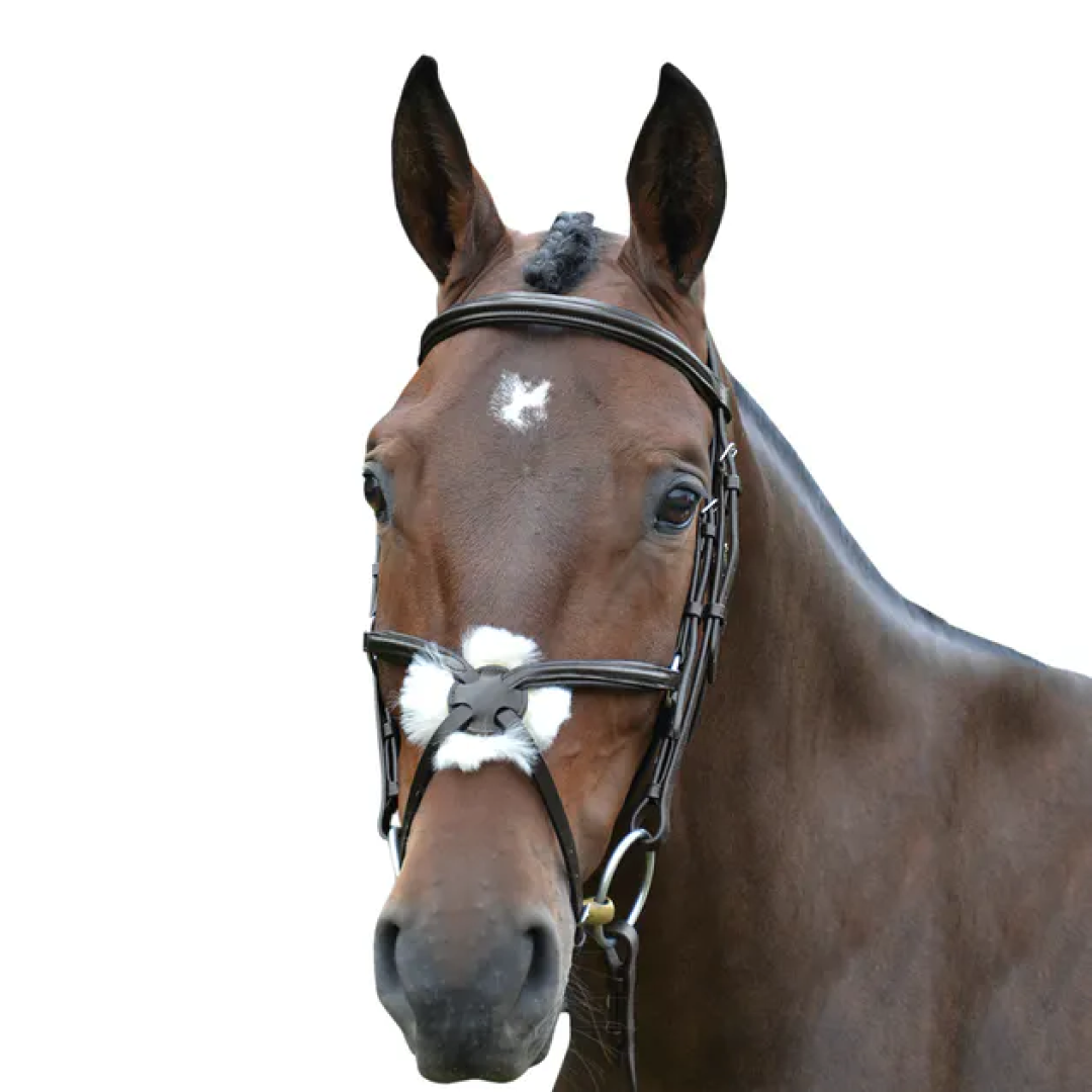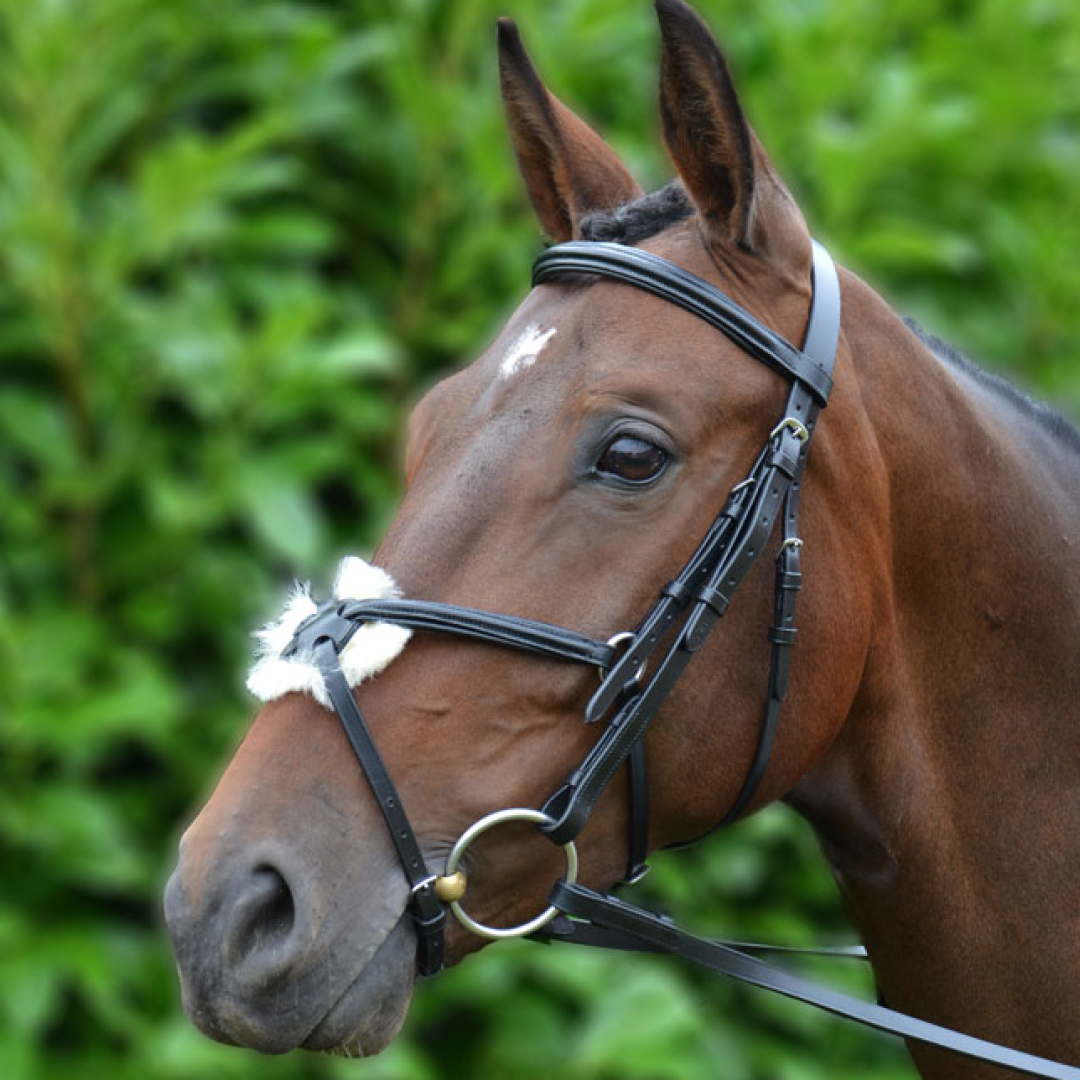 A quality Mexican Grackle bridle with a raised and padded browband and noseband. The soft faux shearling pad reduces pressure on the nose. Complete with ½” rubber grip reins for X Small and Pony size and 5/8” for Cob, Full and X Full to suit the size of the horse.