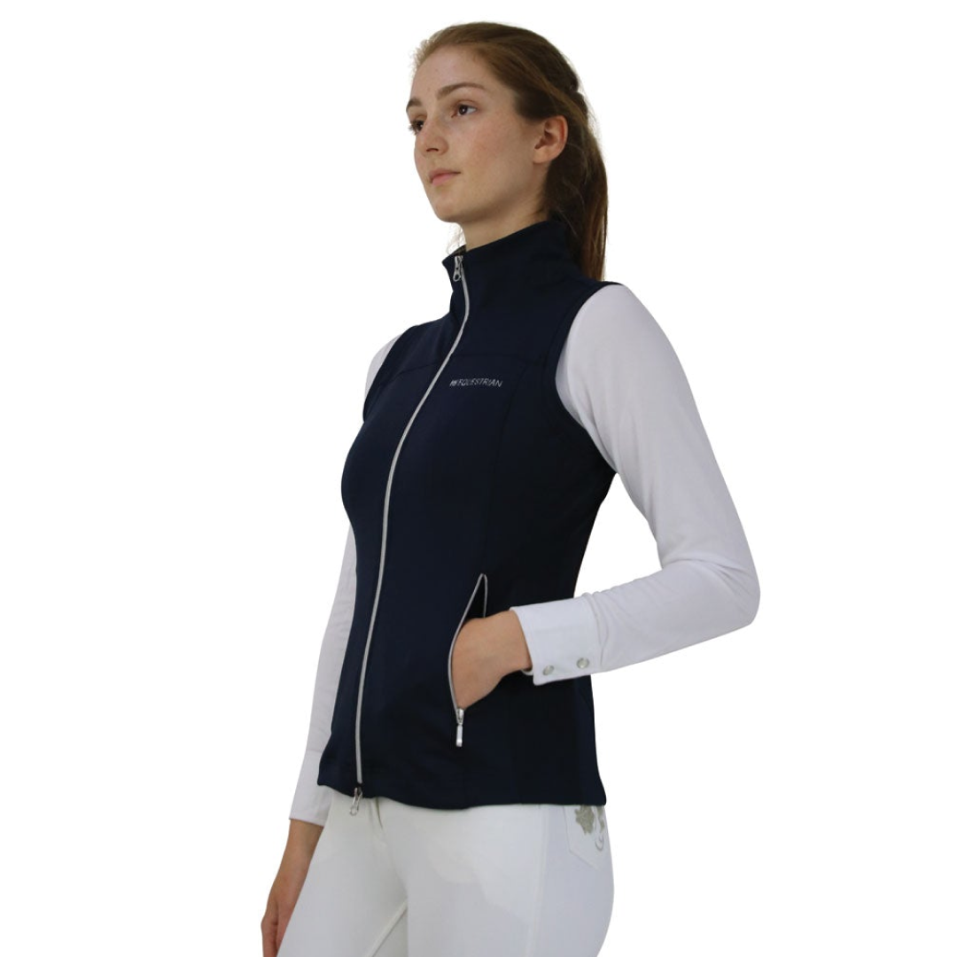 This sporty gilet offers the ultimate in flexibility and comfort as the 4-way stretch soft fabric is lightweight and quick drying. The micro-mesh side panels increase airflow and reduce bulk for a streamlined fit. A silver two-way zip is easily adjusted in the saddle or on the yard and two zipped front pockets provide useful storage. The Hy Equestrian logo is embroidered on the front and the emblem features discretely on the back. This gilet works well with a sports shirt or base layer.