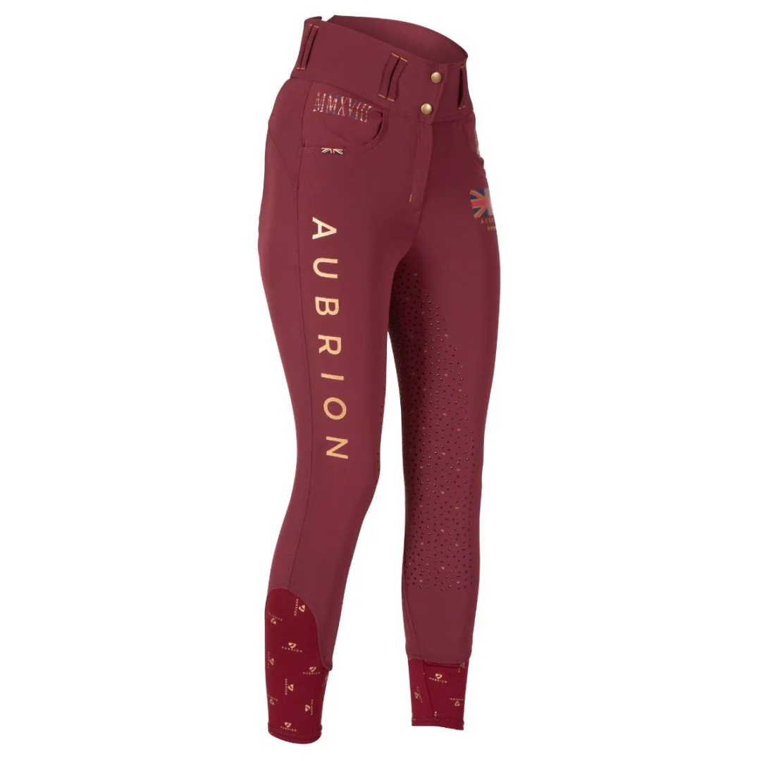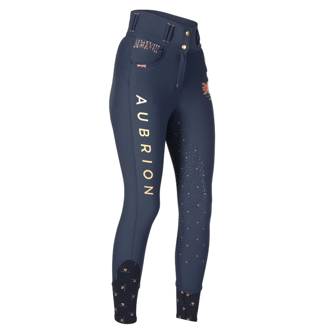 Elegant equestrian breeches in Aubrion Team colours. The Shires Aubrion Team Girls Breeches provides ultimate comfort, superior support and unrivalled style in the saddle. The detail: high-waisted, belt loops, double buttons, hip pockets, zip fly, full silicone seat and leg grips, sleek dry cuffs, Aubrion Team emblems.