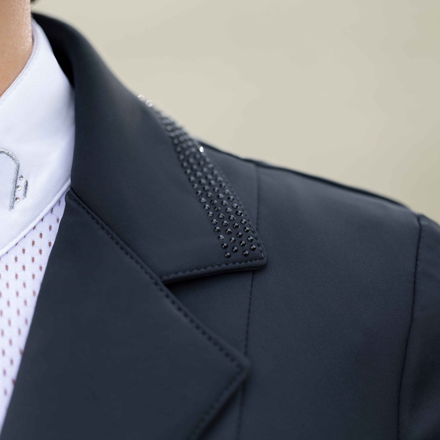 The HKM Children's Competition Jacket combines elegance and function. Made with crease-resistant material and a dirt-repellent surface, it always looks flawless and is easy to care for. Its rhinestone accents and hidden zipper add style, while riding slits and practical pockets provide comfort and freedom of movement.
