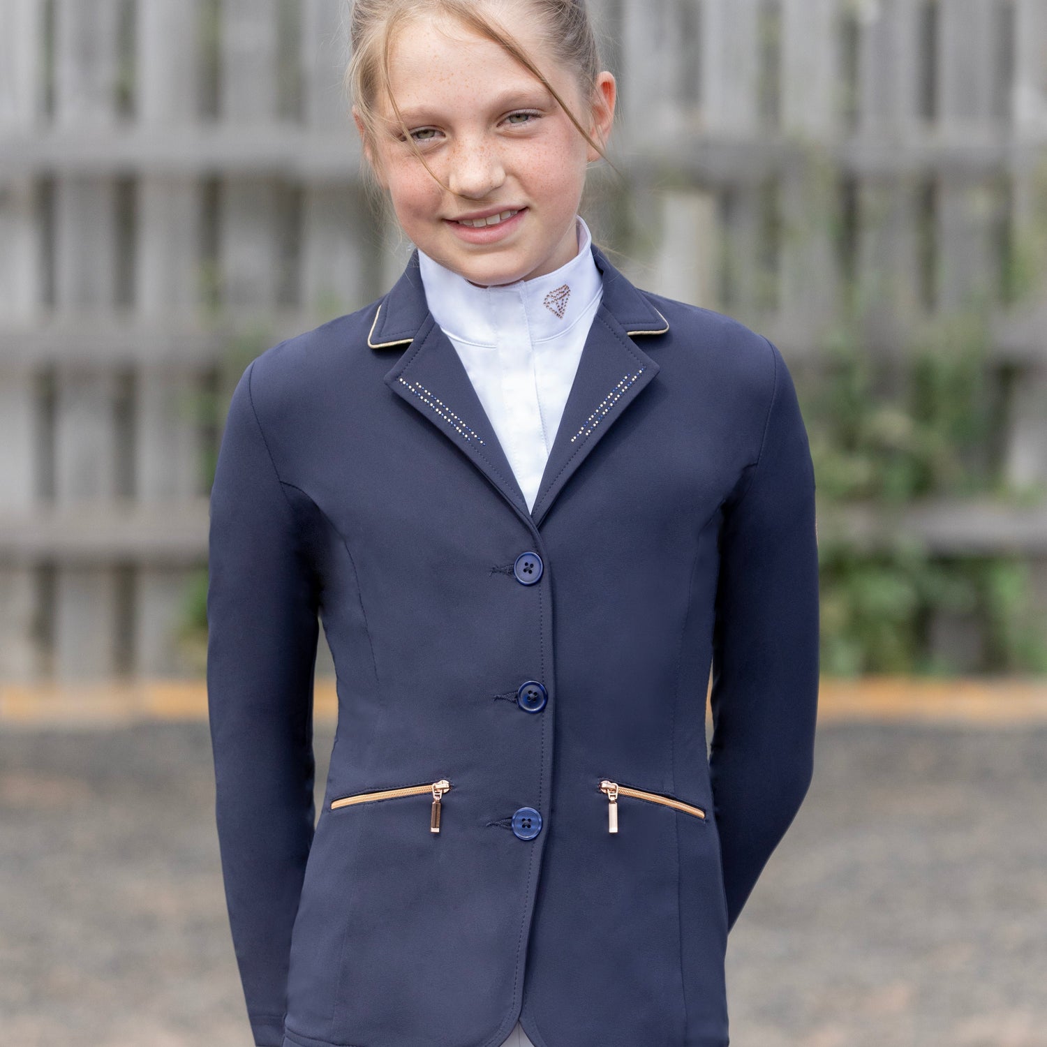 Hy Equestrian Cadiz Mizs Children's Show Jacket - Navy/Rose Gold / 7-8 Years is backordered and will ship as soon as it is back in stock.