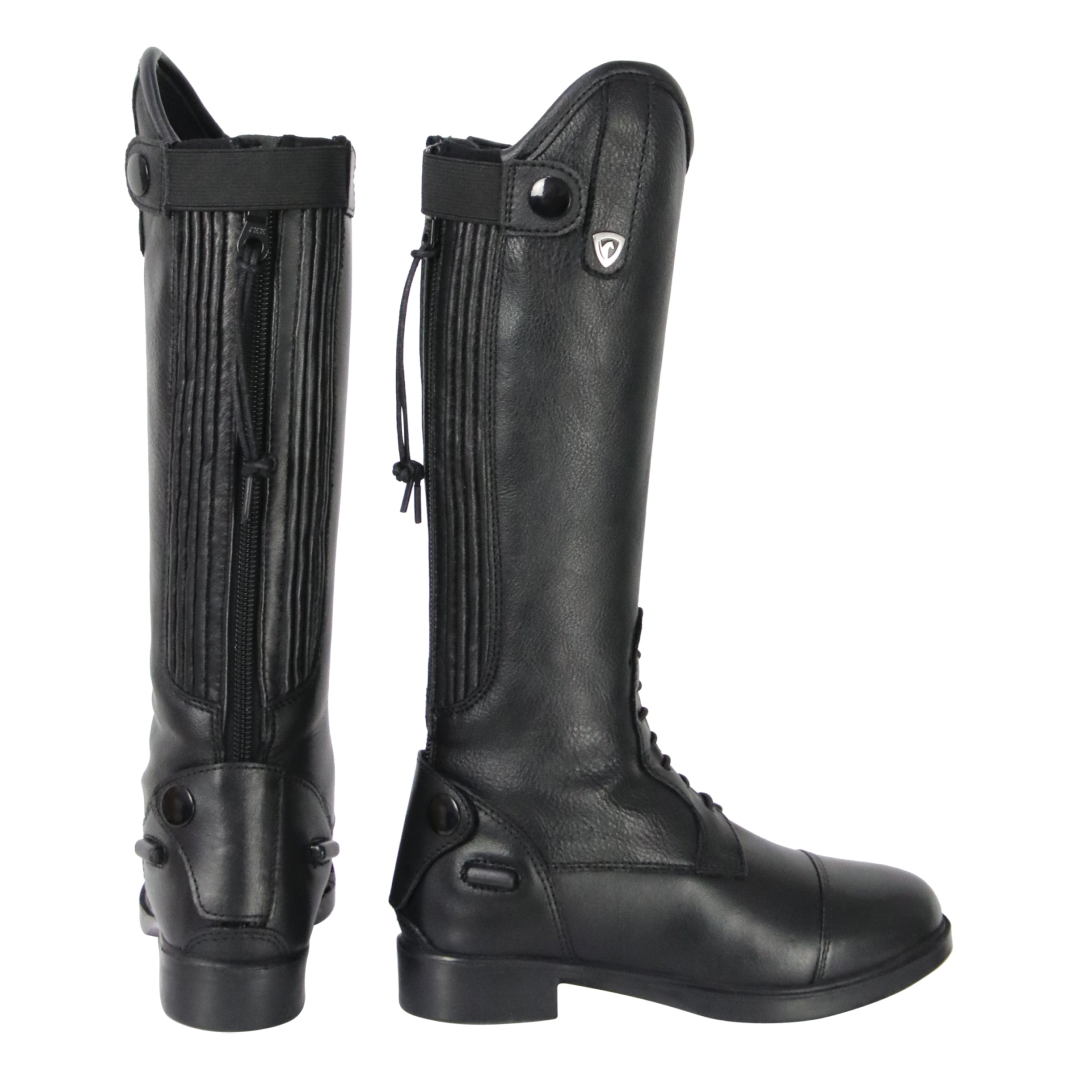 This stylish long boot is perfect for competition or every day. Fitted with lace fronts for the classic field boot look and elasticated back panels for a streamlined fit, added comfort, and ease of fastening. Featuring spur studs on the heel for optional use and press button spur guard to the bottom of the boot. These boots are finished with a zip fastening and top press stud closure and are fully lined for added comfort and sit on an anti-skid sole for added durability and stability.