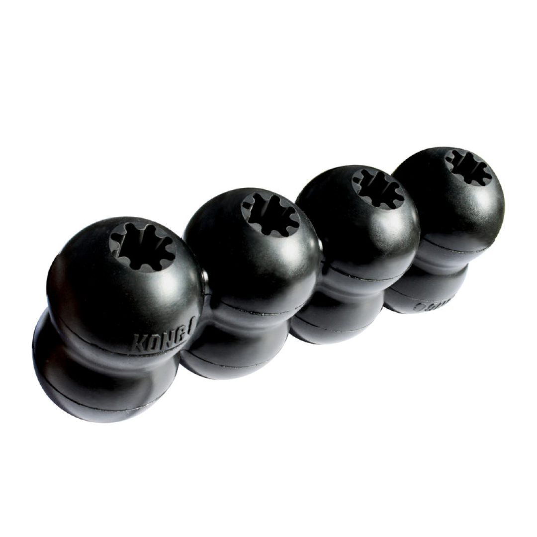 A treasure trove of chewing! A unique bone shape and durable KONG Extreme Rubber satisfies and rewards natural chewing instincts while providing a long-lasting solution that keeps dogs engaged. Stuff KONG Extreme Goodie Ribbon’s four spaces with treats and the Goodie Gripper™ ridges inside will make getting the nibbles out a mentally challenging puzzle for dogs. Ideal for stuffing with KONG Easy Treat, KONG Snacks or a dog’s favourite kibble.