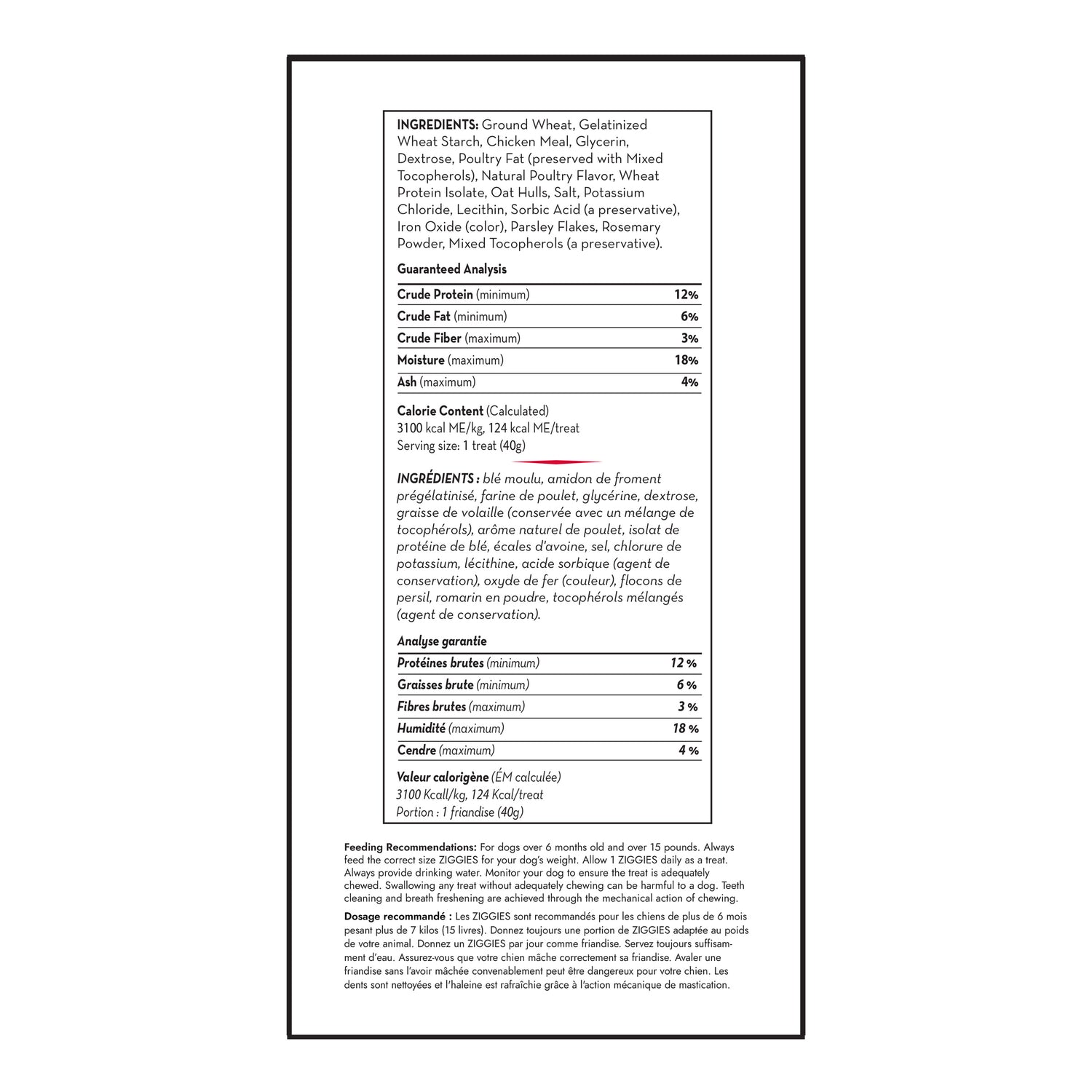 KONG Ziggies are a healthy treat made with a savory chicken flavor. These deliciously chewy treats are safe, highly digestible and freshen your dog’s breath. When stuffed in your dog’s large KONG rubber toy, Ziggies last twice as long as the leading chew treat.