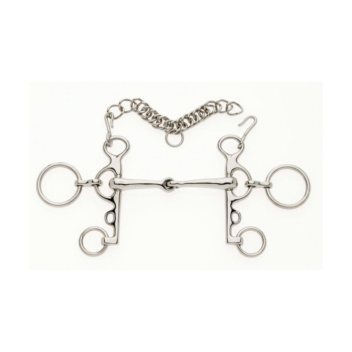 Jointed mouthpiece exerts pressure on the bars and roof of the mouth. Designed to be used with two reins and ideal for the show ring for horses that won't except two bits.