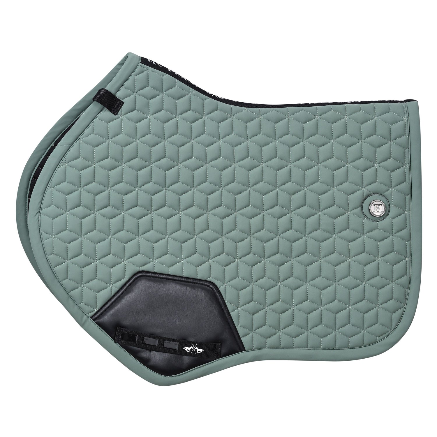 The PU girth protector adds extra reinforcement and protects against wear and tear. Its special lining helps regulate moisture absorption and sweat release, and the brand logo tape at the backline and silicone grip print at the girth strap add a professional touch. With a dirt repellent top material, unique quilting, and a round metal logo plate, this saddle pad is both functional and stylish.