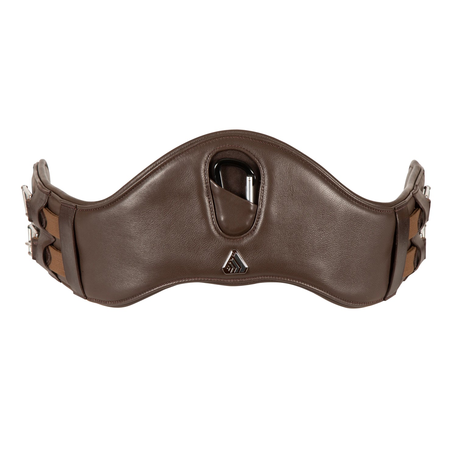 The short stud girth features a symmetry promoting contoured form for an ergonomic natural fit, shaped to protect the underside of the horse when using a range of motions. A sleek, carefully engineered design keeps a refined feel. Strong and hardwearing outer leather flexes but resists stretching for longevity. Butter soft calf leather lining is forgiving against the body. Pressure dispersing padding gives the horse greater freedom of movement with improved range for advanced performance. Smooth, continuous girth edges are padded and curve away from the horse to prevent a harsh edge. Recessed central carabiner for easy attachment of training aids or breastplates. Short straps with high quality stainless steel fittings and twin girth roller buckles. Triple layer pressure alleviating elastic at either end. Eco-friendly vegetable tanned European leather.