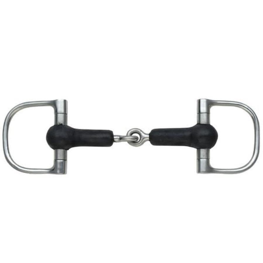 This rubber covered bit has D-ring sides to assist steering and prevent the bit being pulled through the mouth. Good for young horses. Mouthpiece thickness: 16mm. Cheek height: 70mm.