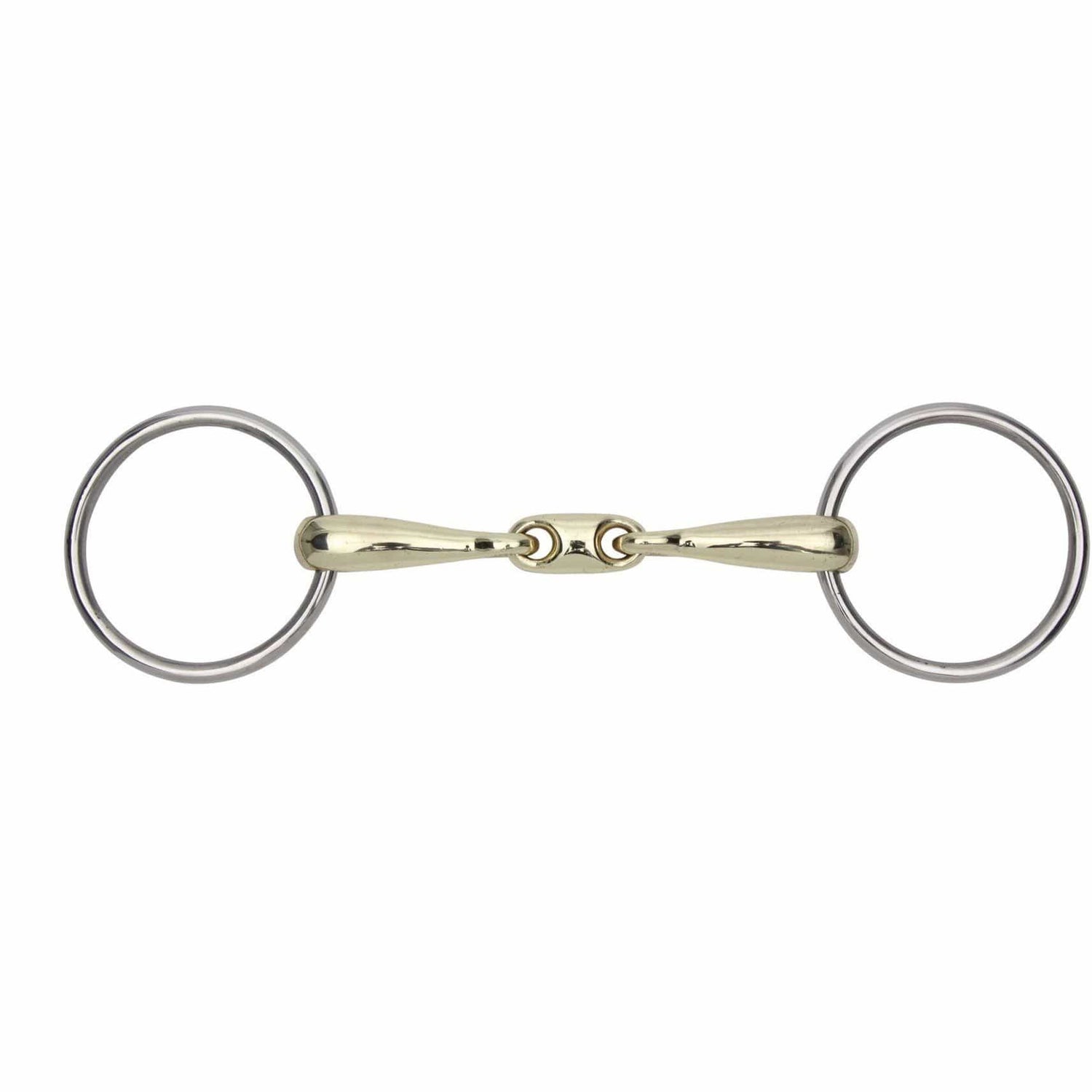 This training bit has a brass alloy mouthpiece to help the horse soften.