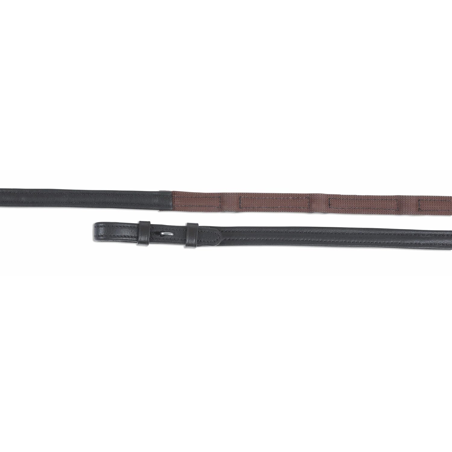 Combining a soft leather outer with a fine rubber pimple grip lining, these dressage reins are smart yet effective. Spaced leather stoppers for improved control on both reins. Hook stud billets and stainless steel fittings. Restrained design gives Velociti GARA leatherwork enduring appeal.