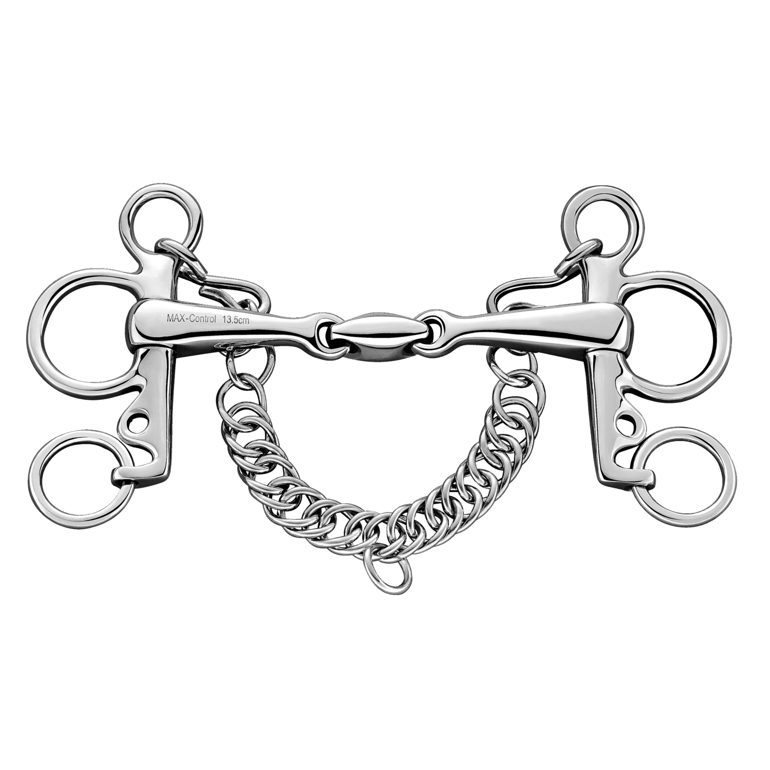The MAX-Control Pelham is double jointed and can develop a bar effect when the reins are taken up. It enables targeted and effective aids to be given, which act on the tongue, poll and the lower jaw. Depending on the buckling, the leverage effect on the neck can be varied as desired. This gives you the opportunity to respond individually to your horse.