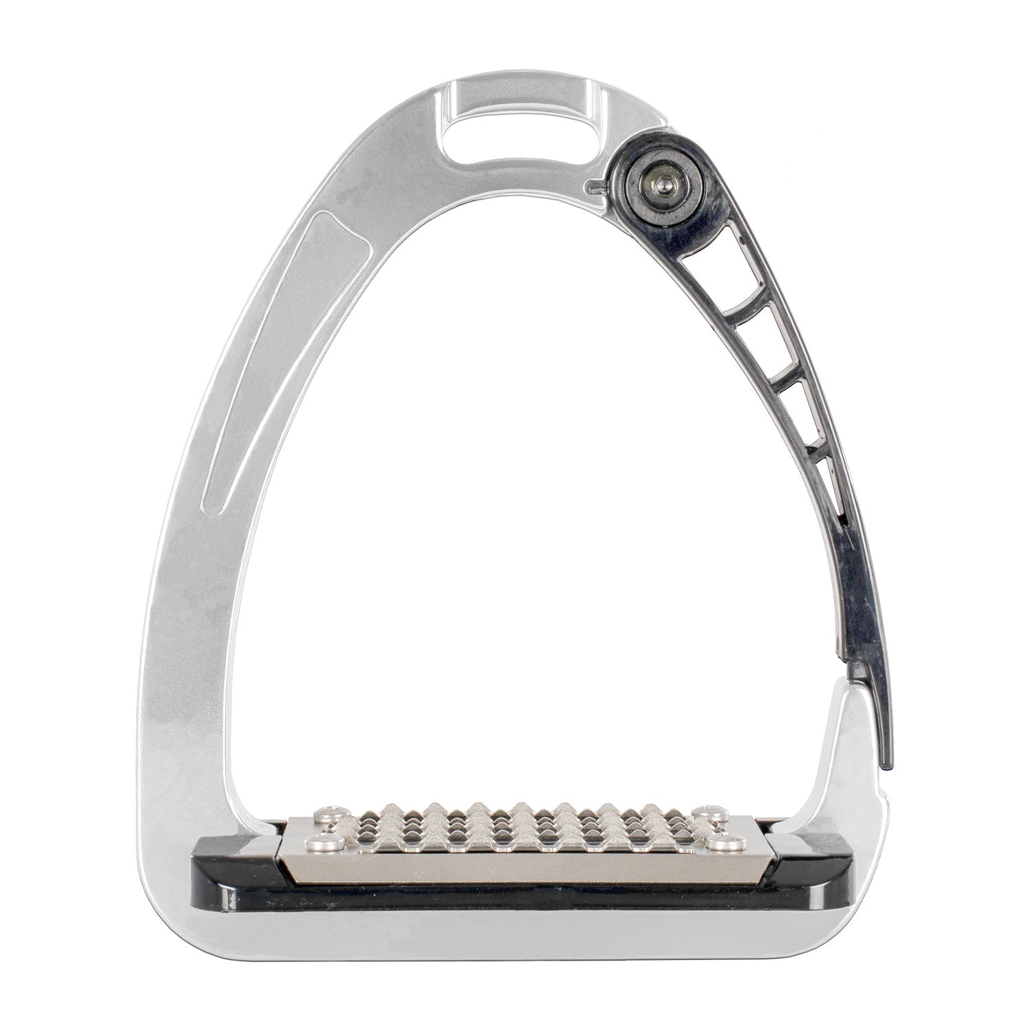 Additionally, a strategically-placed lock and release mechanism prevent accidental slipping, ensuring rider safety. The stirrup bow is constructed from durable aluminum, while the opening arm is made of a special polyamide material. Both the stirrup pad and tread are fabricated from high-quality polyamide and stainless steel respectively.