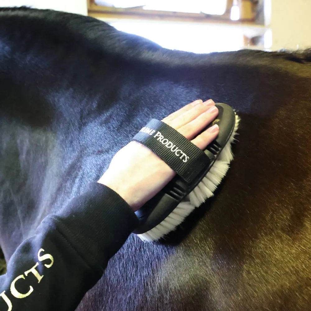 A luxuriously soft grooming brush made with goat hair designed to produce the ultimate show ring shine on your horse’s coat. This super soft brush is ideal for those with sensitive skin or clipped coats, and is perfect for lifting and removing fine particles of dust and dirt. The flexible design allows the brush to contour your horse’s shape for an effective clean, while making it comfortable to hold and easy to use. Featuring an elasticated strap with Supreme Products branding.