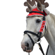 (Please Note: Antlers are sold separately.) This festive bridle set comes with three decorative pieces complete with four bells. Place the set on the brow band and nose band of your bridle. The quick to fit Velcro design will accommodate a range of bridles perfect for a Christmas photo. One size fits all.