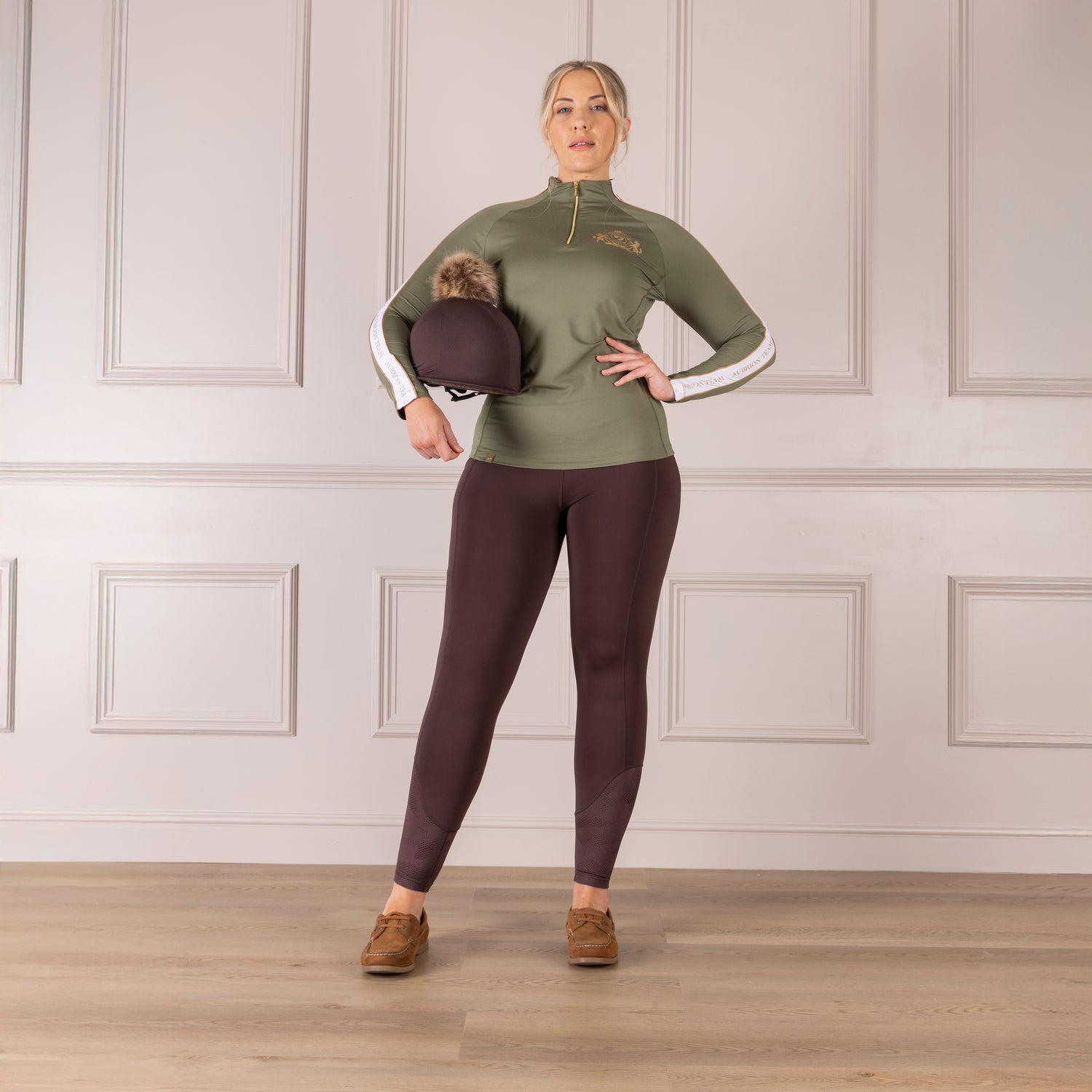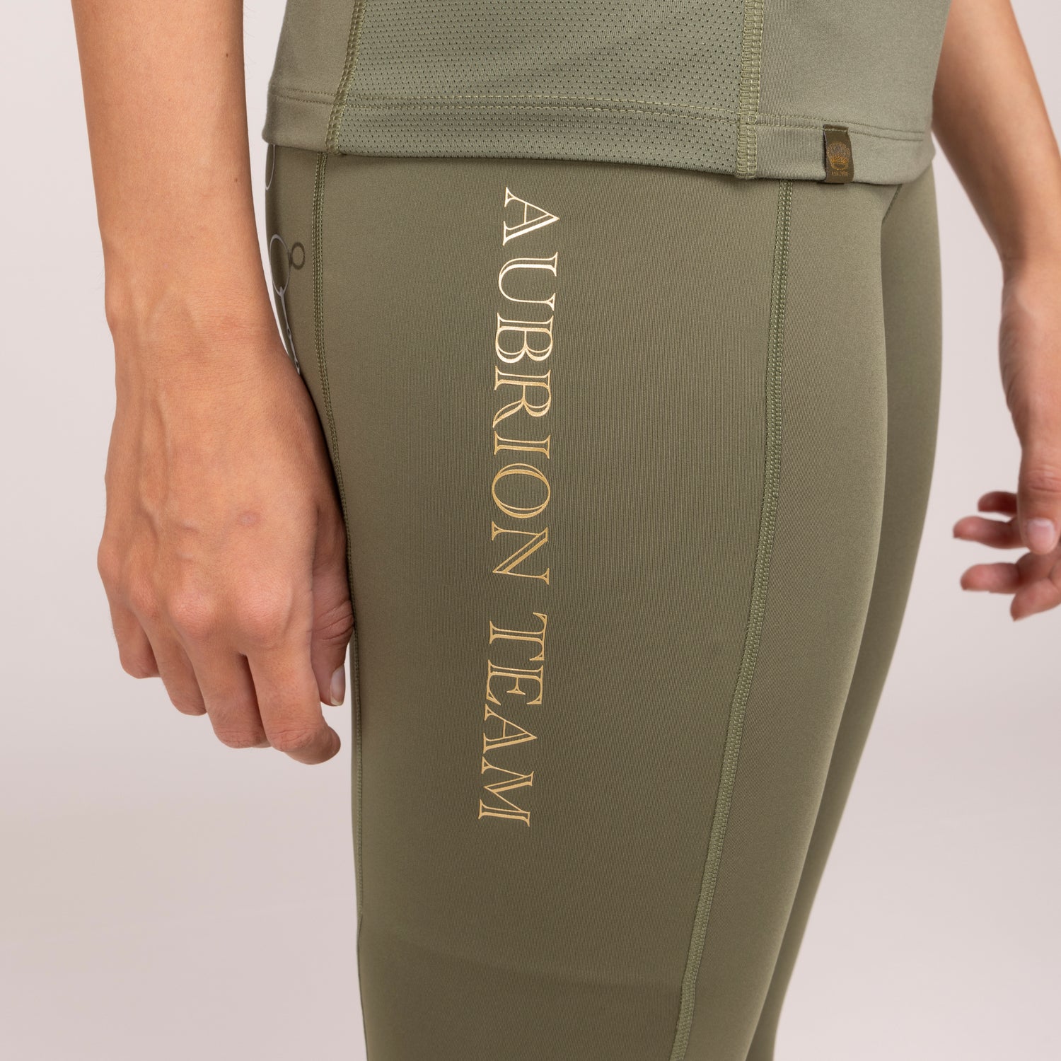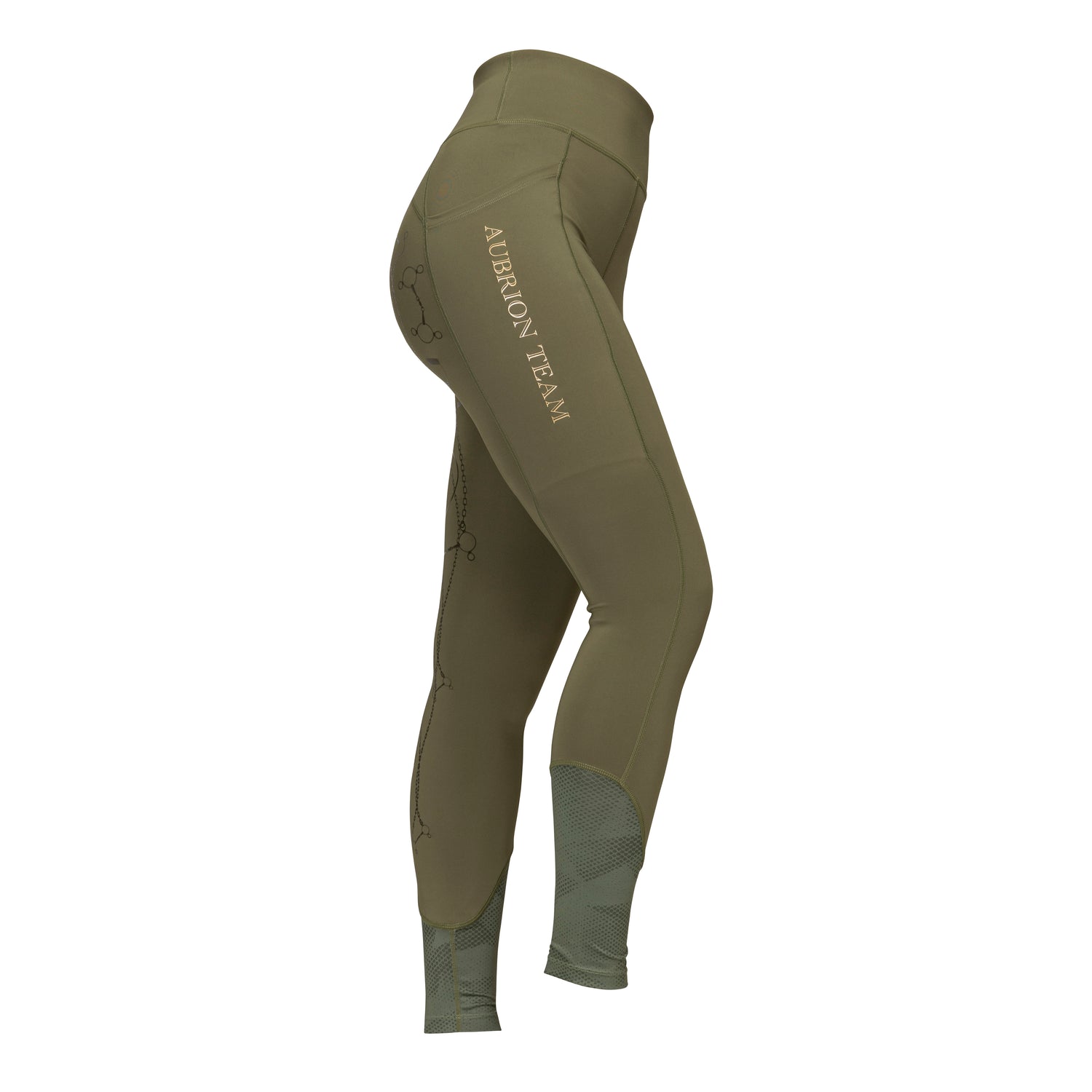 Add an elegant sleek look to your style with the Aubrion Team Riding Tights. Supportive and shaping for an elegant smoothing effect, the sleek deep waist gives a flattering contour look. The tights offer flex-fit stretch and moisture management for comfort, silicone grips add in-saddle security. To help with temperature control and for a smooth fit, the lower leg is styled with highly breathable stretch cuffs. Style detail: shapes and supports, flex-fit stretch, moisture management, high contour waist, thigh phone pocket, full silicone grips, comfort seams, ankle cuffs and Aubrion Team prints.