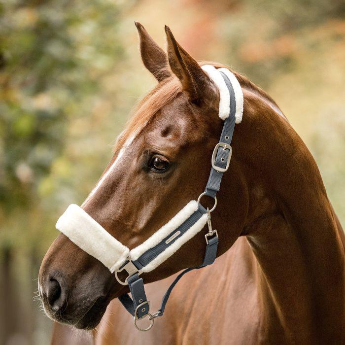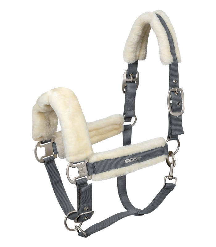 Quality halter with soft padding in synthetic fur on headpiece, noseband and cheekpieces. Easily adjustable at chinstrap and on both sides of headpiece. With matt silver-coloured fittings and silver-coloured Waldhausen logo.