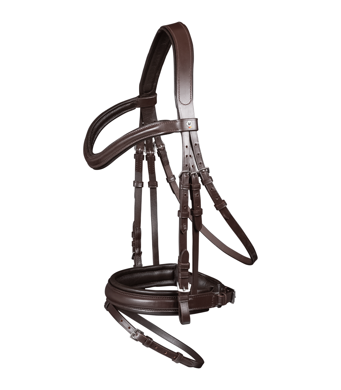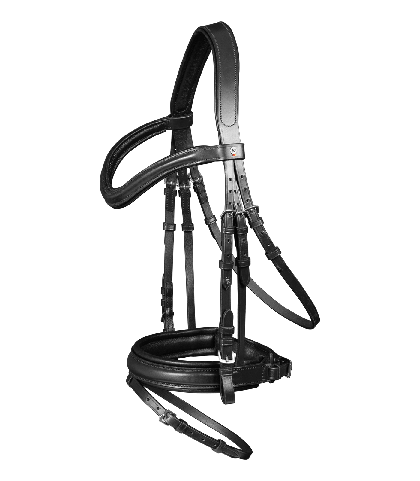The bridle features a pull-back noseband for a secure and precise fit, an anatomically shaped headpiece to reduce pressure and improve comfort, and a softly lined curved browband for a sophisticated look. Complete with stainless steel fittings and 19 mm continental reins, this bridle is built for performance and durability.