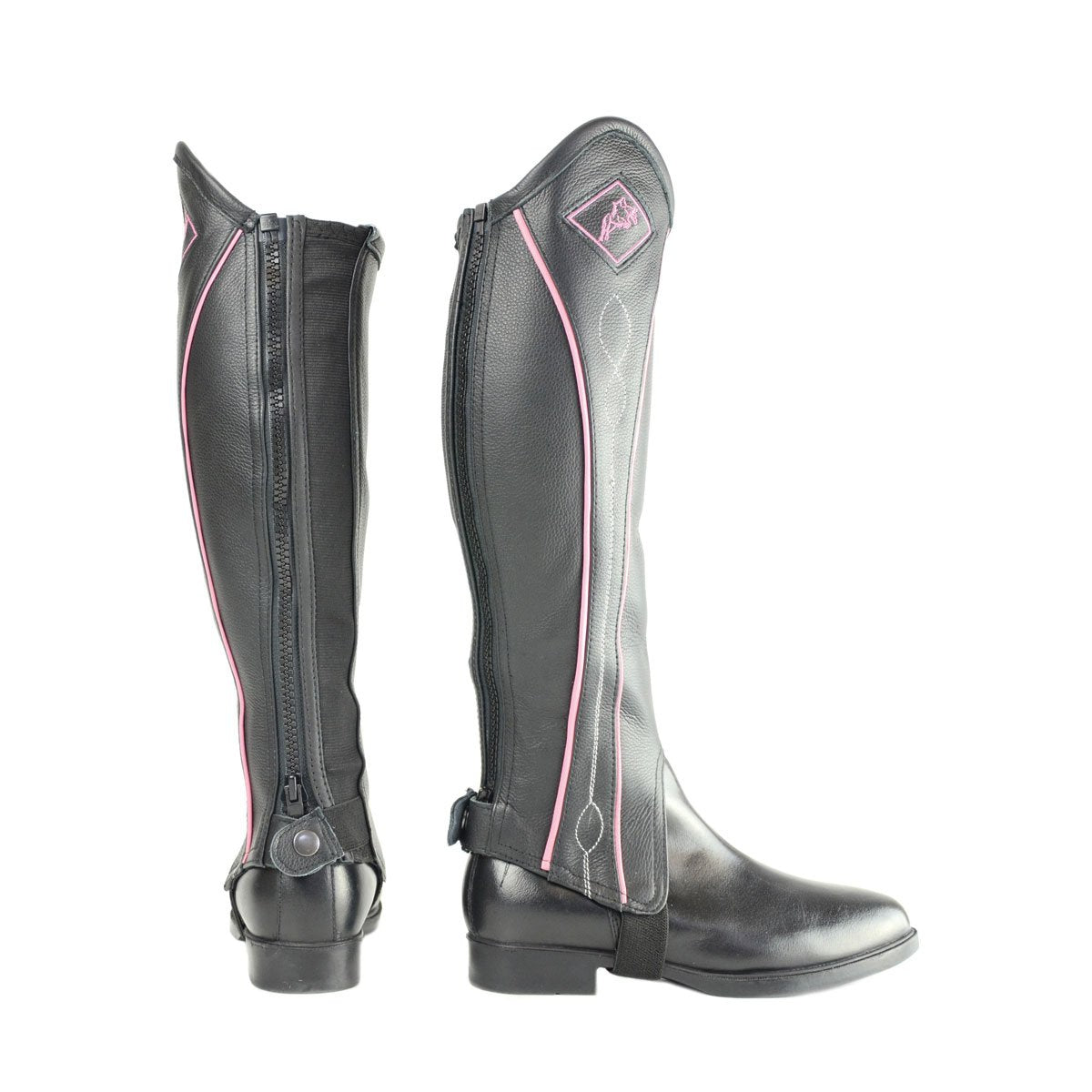 A high quality leather gaiter with a difference! Close fitting with an elasticated calf to accommodate a wide range of shapes and sizes, complete with a YKK zip fastening and secure press stud at the bottom. With a pink trim and a pink Hy horse logo these chaps will make you stand out from the crowd.