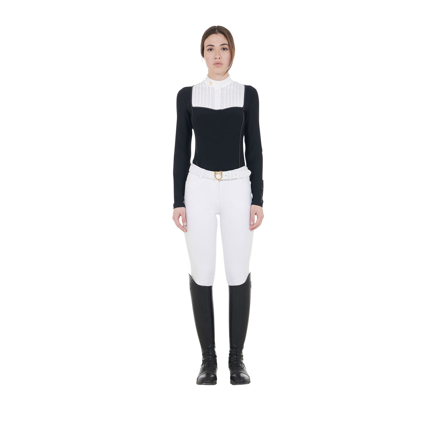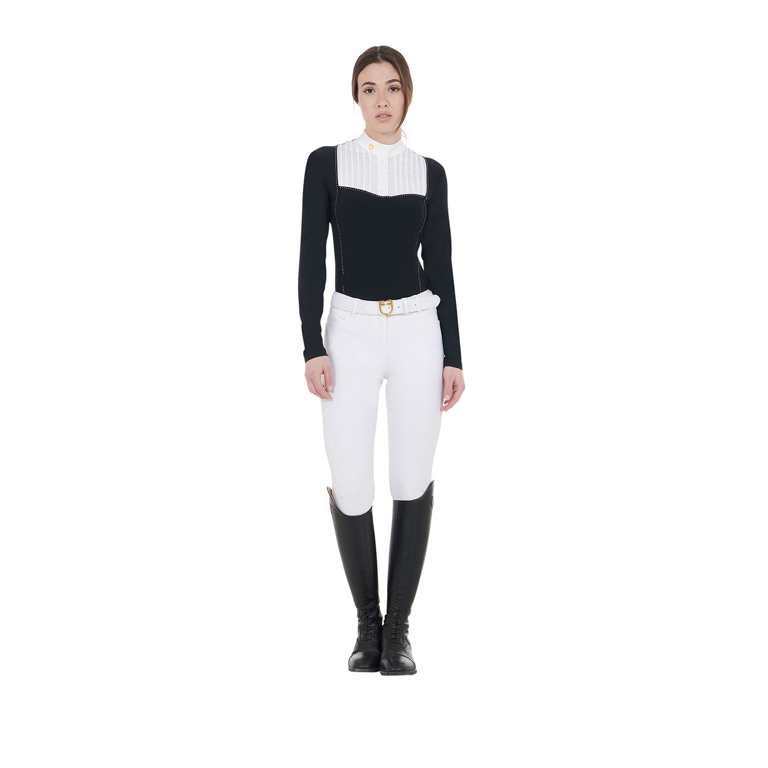 Women's slim fit competition polo shirt in technical fabric and cotton. The combination of fabrics gives the garment an essential and versatile design. Women's slim fit long-sleeved polo shirt made of technical fabric with pleated cotton detail sewn on the chest which adds a touch of distinctive elegance to the design. One of the main features of this polo is its exceptional breathability and thermoregulatory capacity. The garment keeps the rider warm even on the coldest days, maintaining the ideal body temperature for optimal performance.
