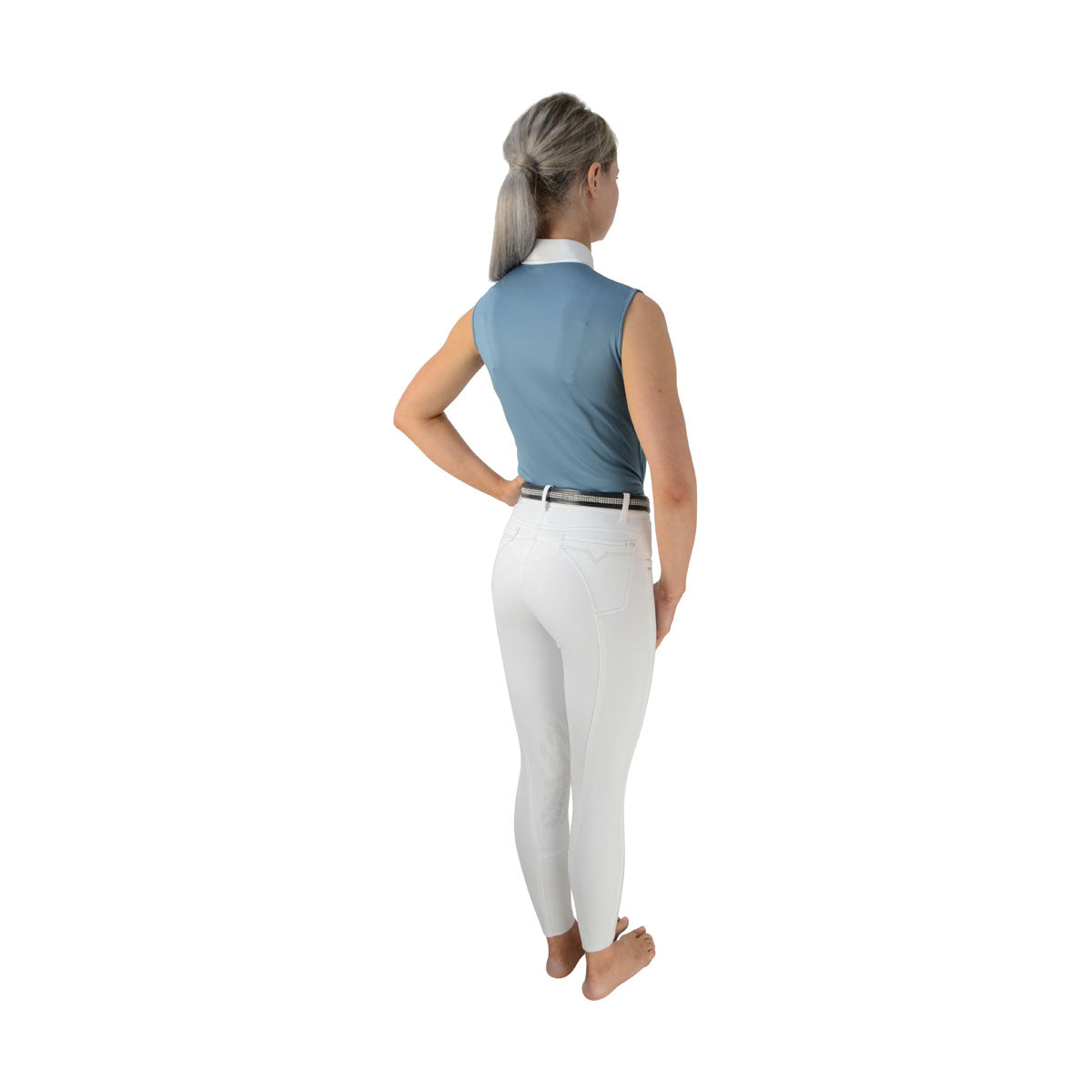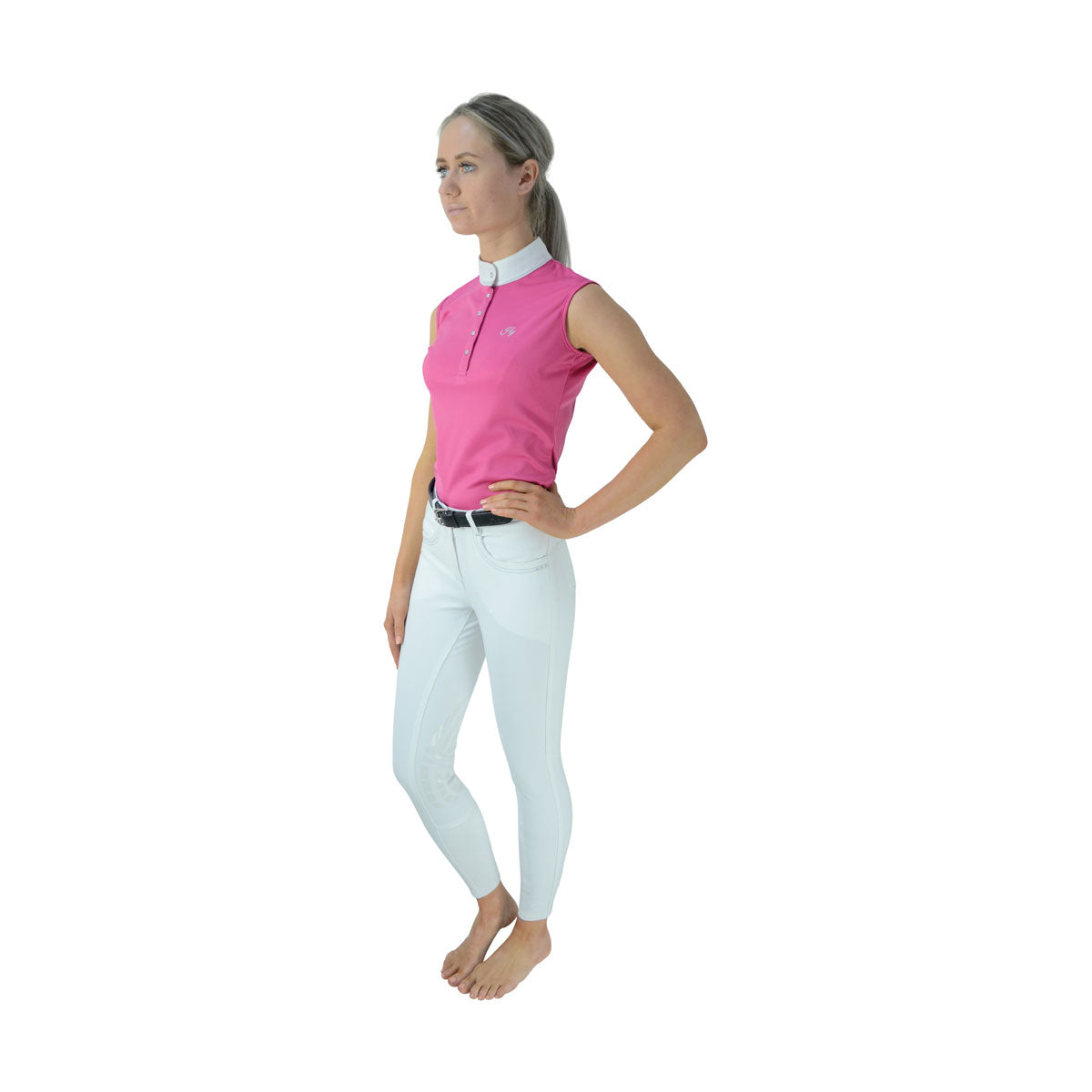 This sophisticated show shirt is beautifully designed with five crystal press studs on the neck placket and a contrasting white colour with silk trim detailing. Made with the leading performance fabric, Dri-tex, the breathable sleeveless shirt repels moisture away from the body for a quick-drying and comfortable fit. The Hy logo is embroidered in silver on the chest for an elegant finish.