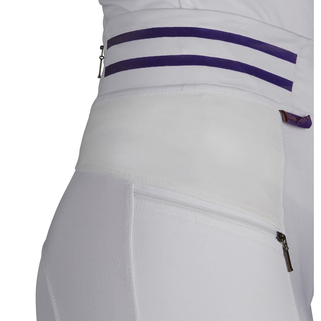 Innovative, flexible sporting fabric teamed with durable silicone knee strips provides riders with a comfortable yet subtle grip, aiding performance by supporting the inner knee and upper calf, allowing the body to move with the motion of the horse. The transparent silicone grip technology used has been tested and certified and in no way restricts movement.