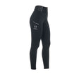 Women's slim fit high-waisted leggings with rhinestones. Made in high quality technical fabric, they offer the ultimate comfort, functionality and style. Women's slim fit leggings in technical fabric, ideal for retaining heat during activity on the coldest days. Thanks to the very soft, high-quality and breathable materials, they wick sweat away from the body, thus keeping the rider dry, as body temperature rises even when it is cold. They represent the perfect balance between comfort and functionality. The silicone logoed grip, carefully positioned at the back and inside the knee, is designed to improve the riding position and increase stability. This offers a secure grip on the saddle, allowing the rider to focus on their performance. They also feature a practical side pocket that allows you to store essentials. The design of these leggings is versatile and lends itself to multiple uses, from fashion to sports. The unmistakable Equestro graphics add an iconic personality to these leggings. The logo, rhinestones at the waist and white piping not only add a touch of glamour, but also catch the light in a sparkling way, bringing a uniquely elegant note to your trainings.