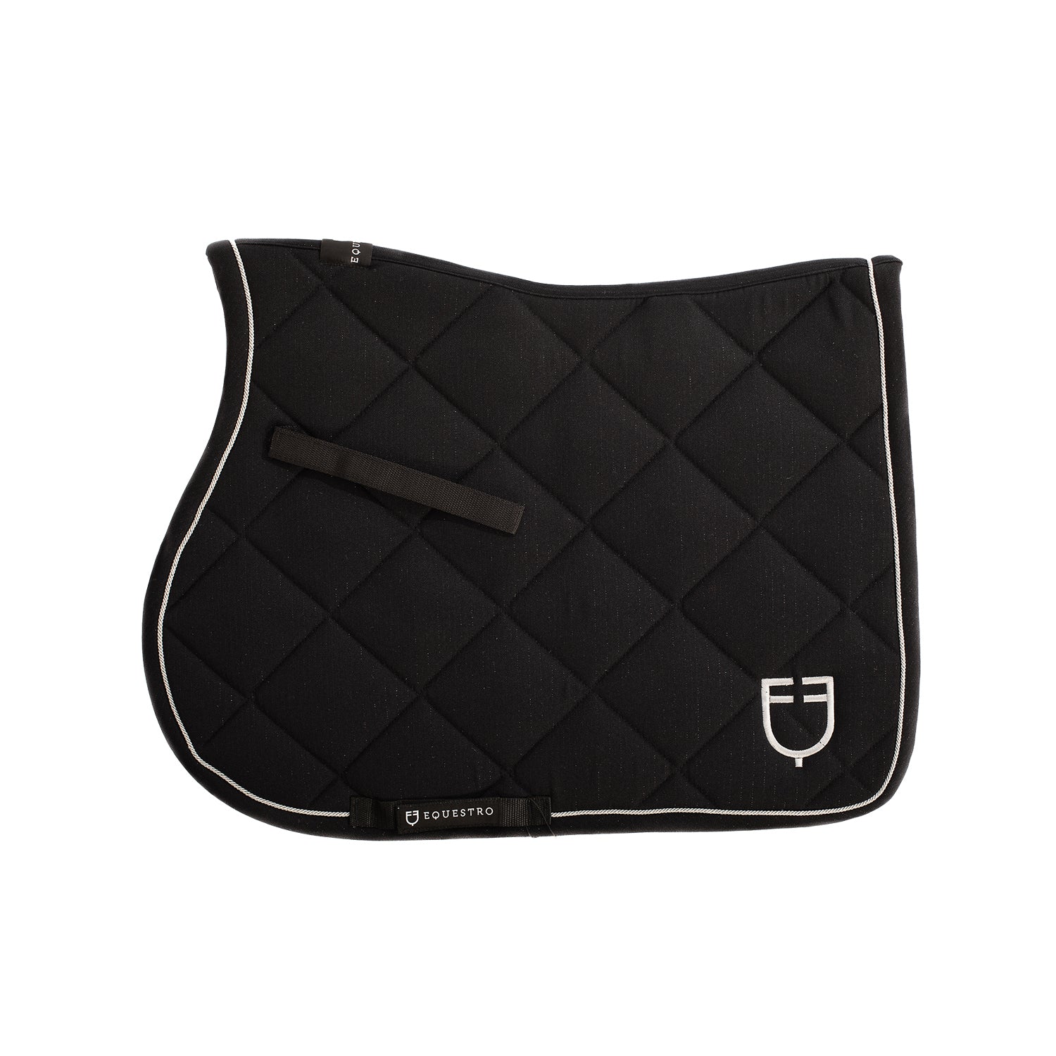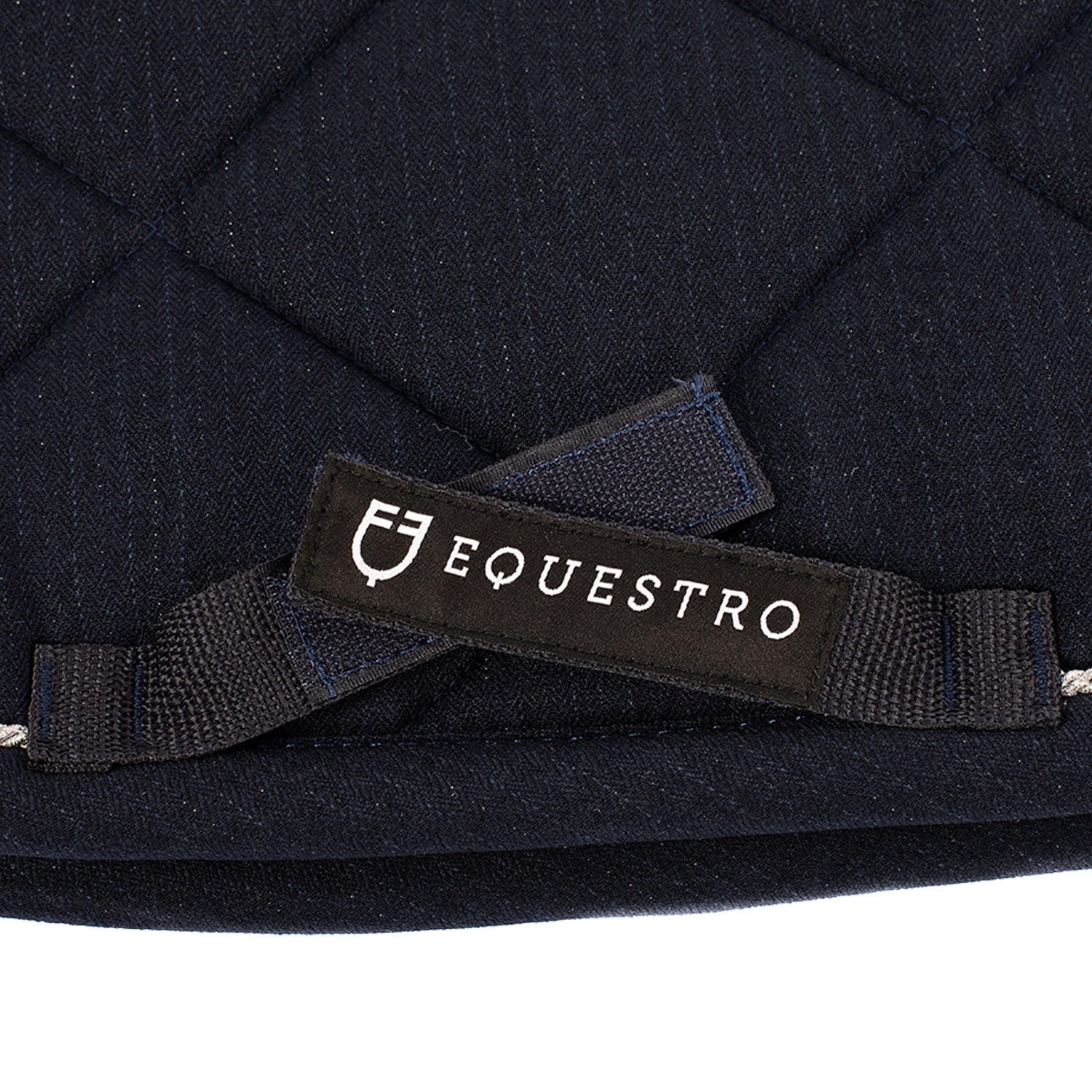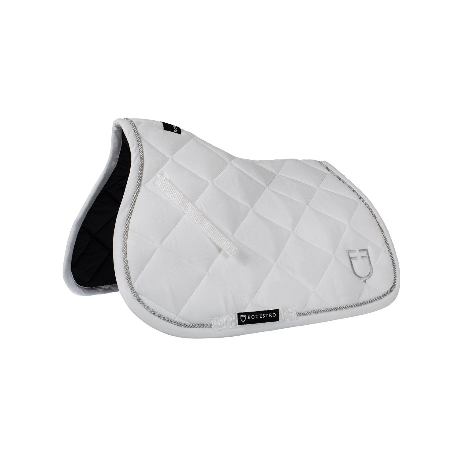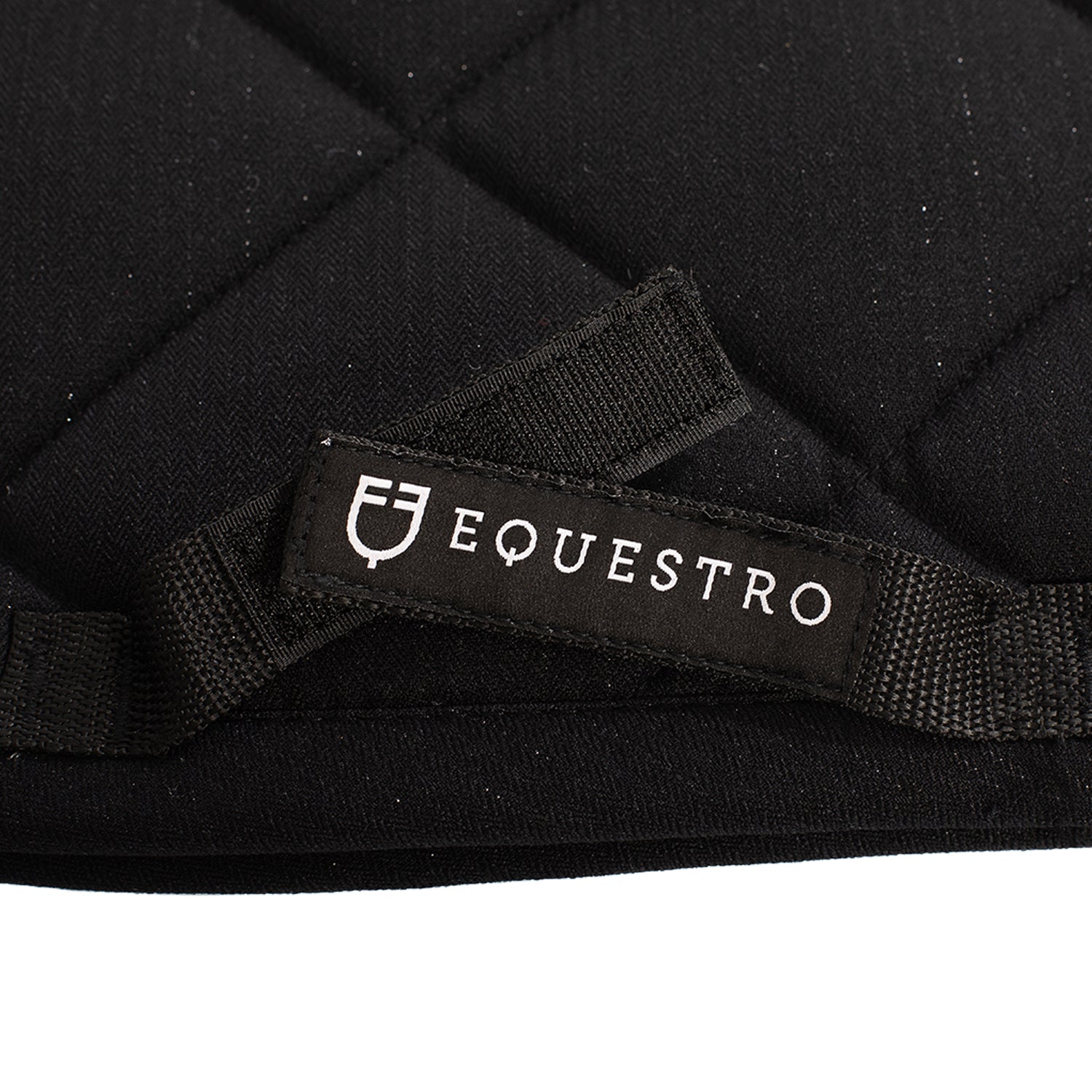 Jumping saddle pad in breathable cotton, embroidered Equestro logo and loops with velcro closure with logo. Logo patch on the withers. The Equestro Jumping Saddle Pad combines padded cotton construction with reinforced girth areas to minimize shocks and prevent saddle displacement. Its breathable design promotes sweat evaporation, keeping your horse comfortable during intense rides. The padded inner layer enhances anti-sweat properties, protects against skin lesions, and absorbs impact. Finished with elegant trimmings, a contrasting logo, and Equestro branding, this saddle pad offers both durability and style for serious riders.